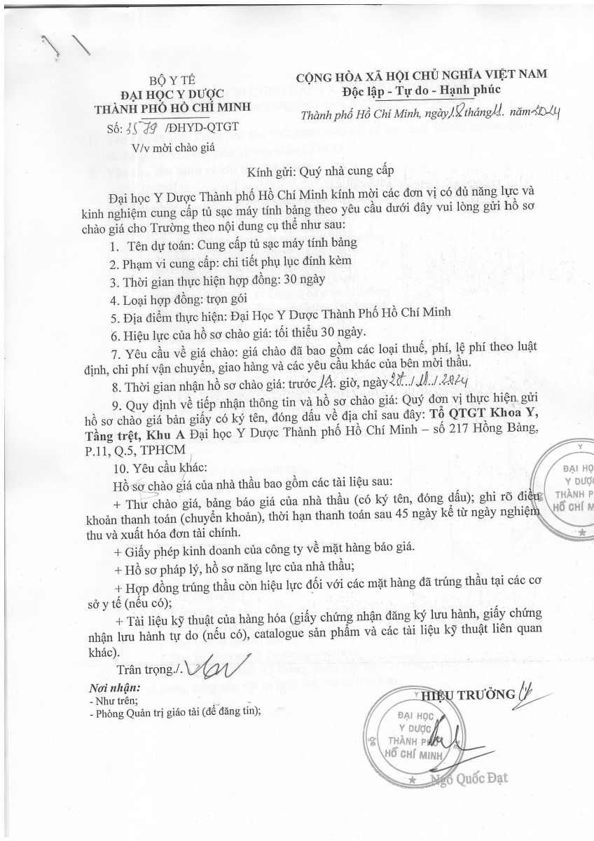 Thời gian nhận hồ sơ chào giá: từ ngày ra thông báo đến trước 14 giờ 00 ngày 27/11/2024
