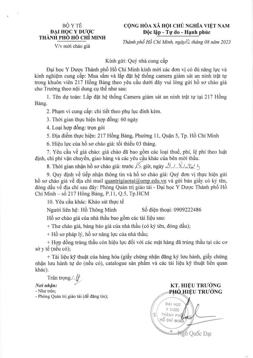 Thời gian nhận hồ sơ chào giá: từ ngày ra thông báo đến trước 15g00 ngày 21/8/2023