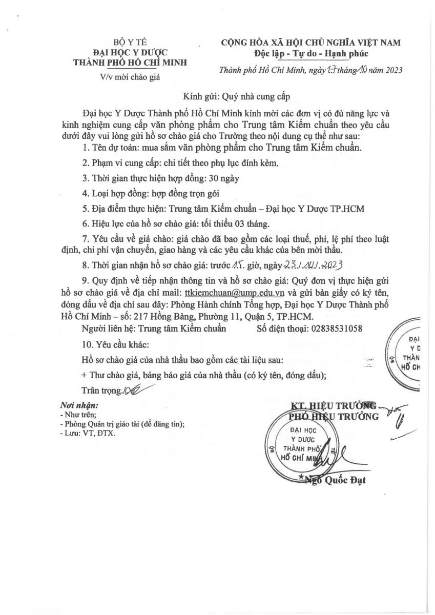 Thời gian nhận hồ sơ chào giá: từ ngày ra thông báo đến trước 15g00 ngày 23/10/2023