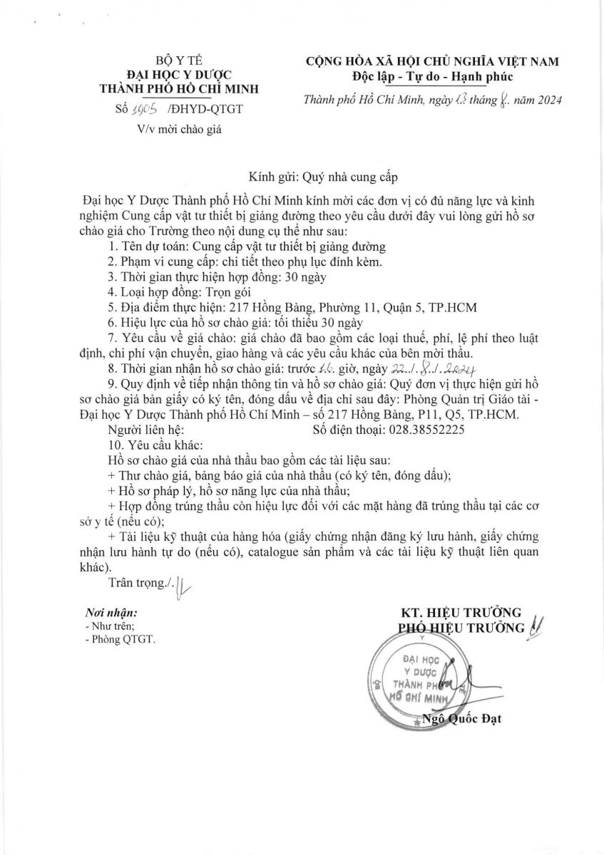 Thời gian nhận hồ sơ chào giá: từ ngày ra thông báo đến trước 16 giờ 00 ngày 22/8/2024