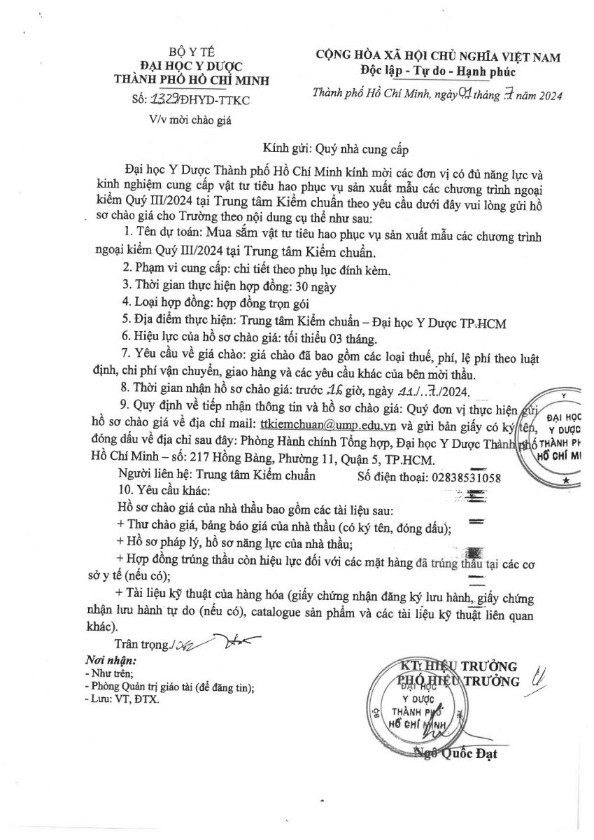 Thời gian nhận hồ sơ chào giá: từ ngày ra thông báo đến trước 16 giờ 00' ngày 11/7/2024