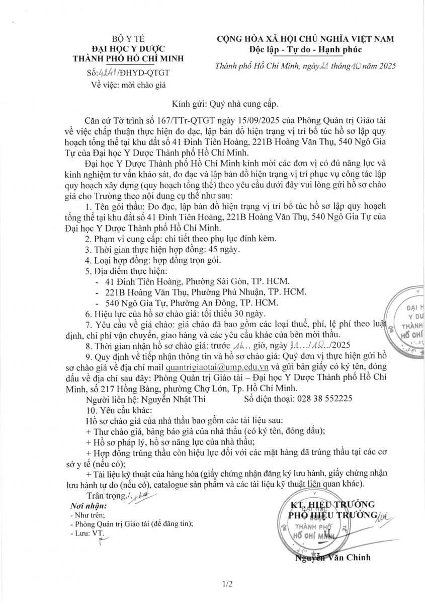Thời gian nhận hồ sơ chào giá: từ ngày ra thông báo đến trước 16 giờ, ngày 31/10/2025