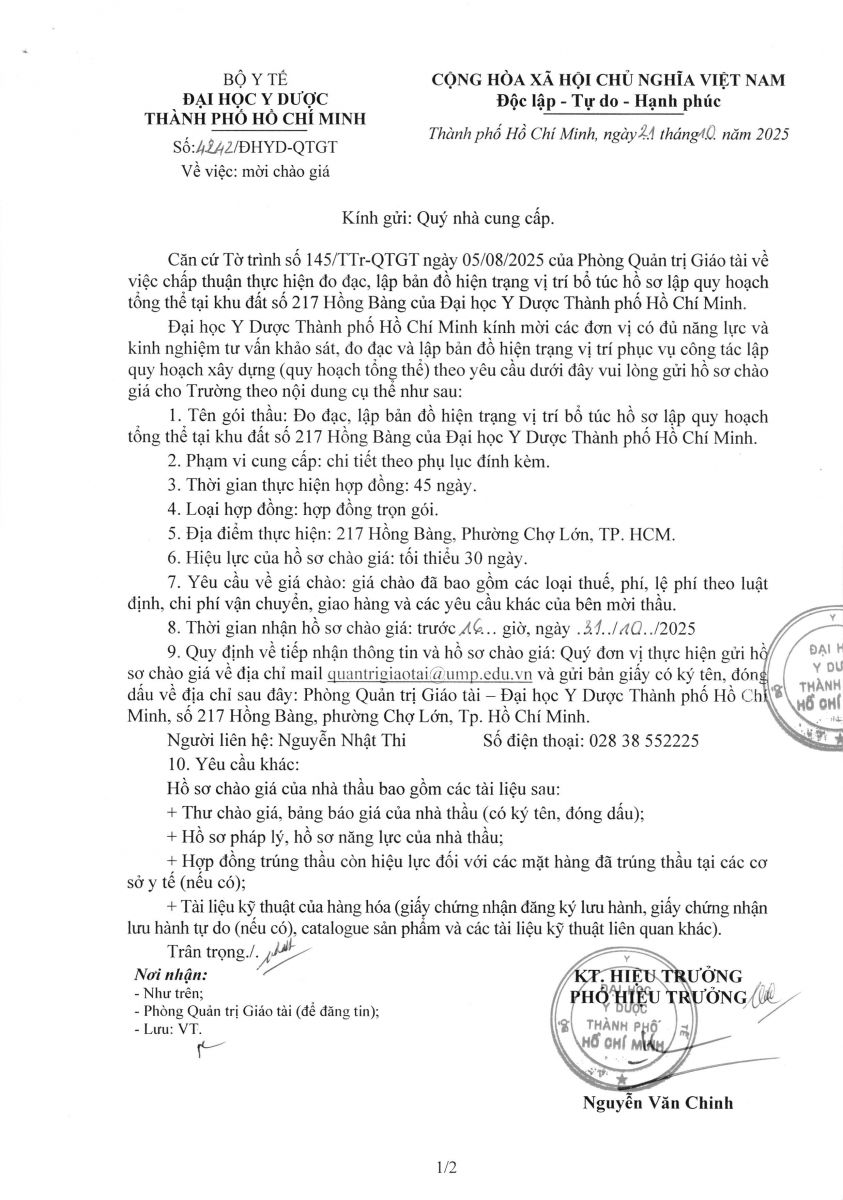 Thời gian nhận hồ sơ chào giá: từ ngày ra thông báo đến trước 16 giờ, ngày 31/10/2025