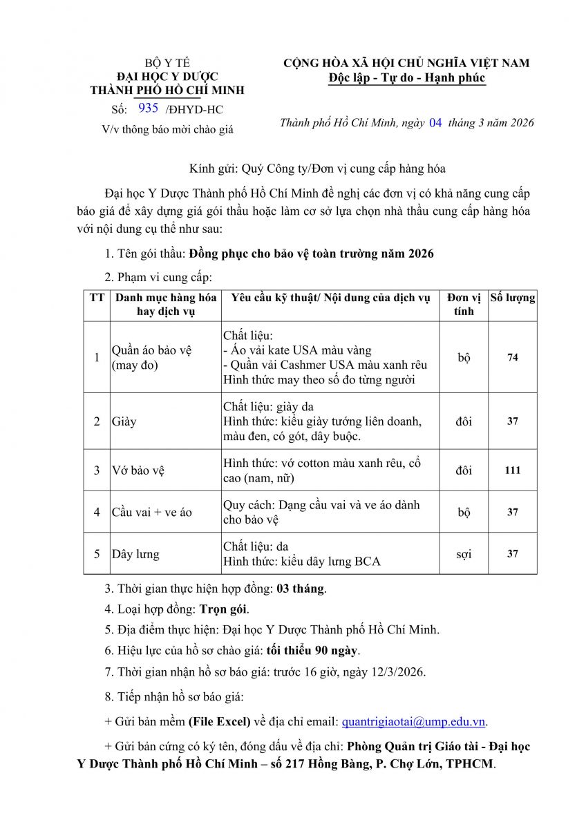 Thời gian nhận hồ sơ chào giá: từ ngày ra thông báo đến trước 16 giờ 00, ngày 12/3/2026