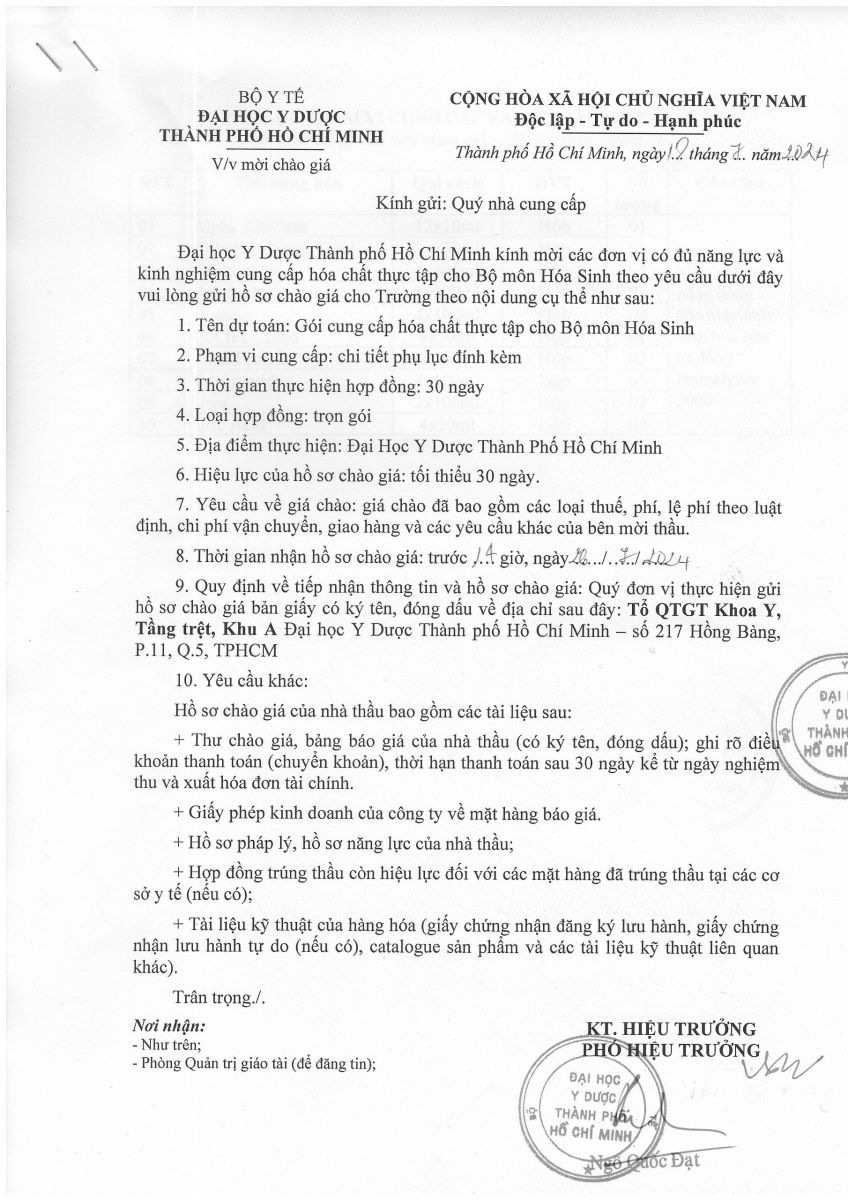 Thời gian nhận hồ sơ chào giá: từ ngày ra thông báo đến trước 14 giờ 00' ngày 26/7/2024