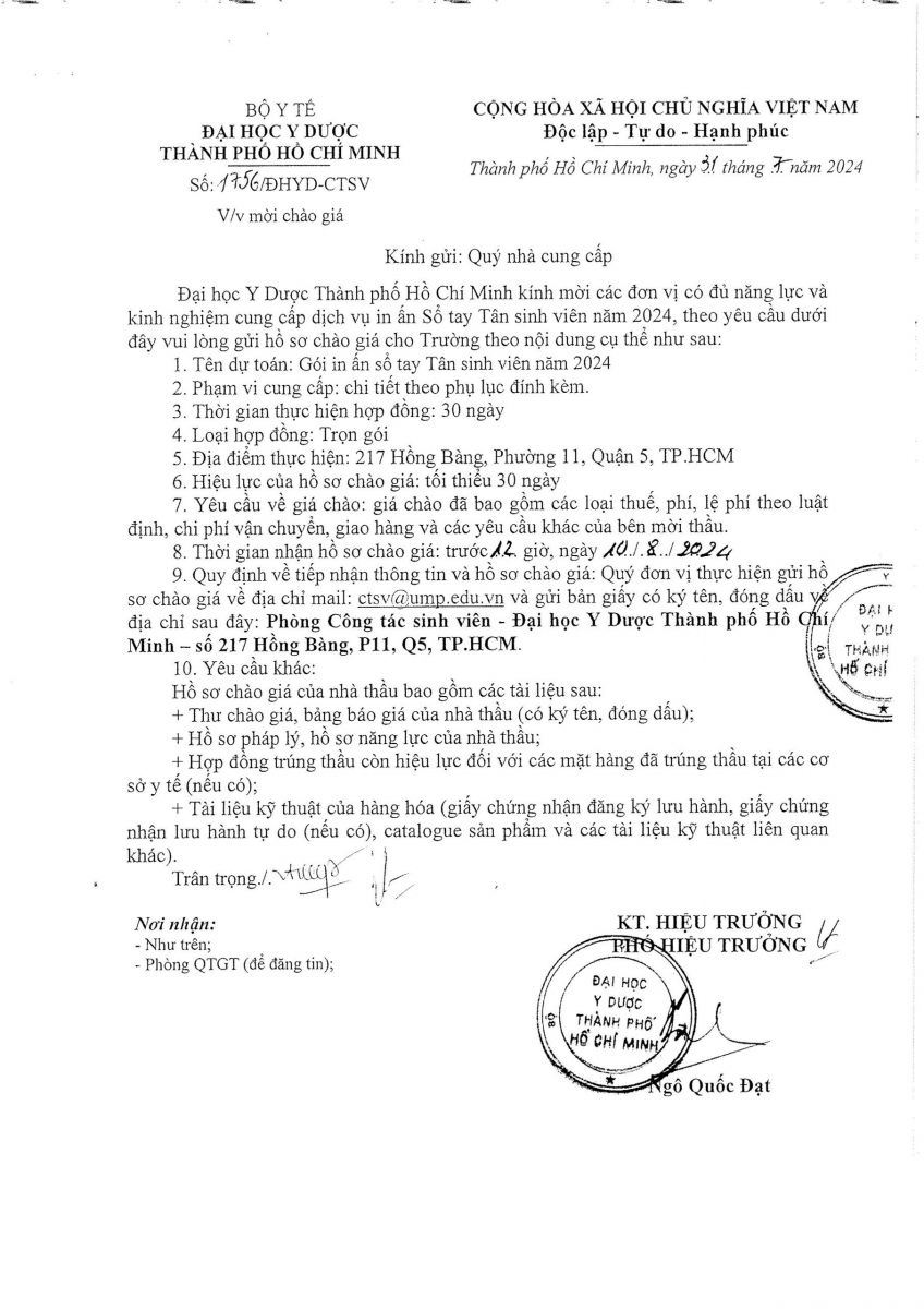 Thời gian nhận hồ sơ chào giá: từ ngày ra thông báo đến trước 12 giờ 00 ngày 10/8/2024