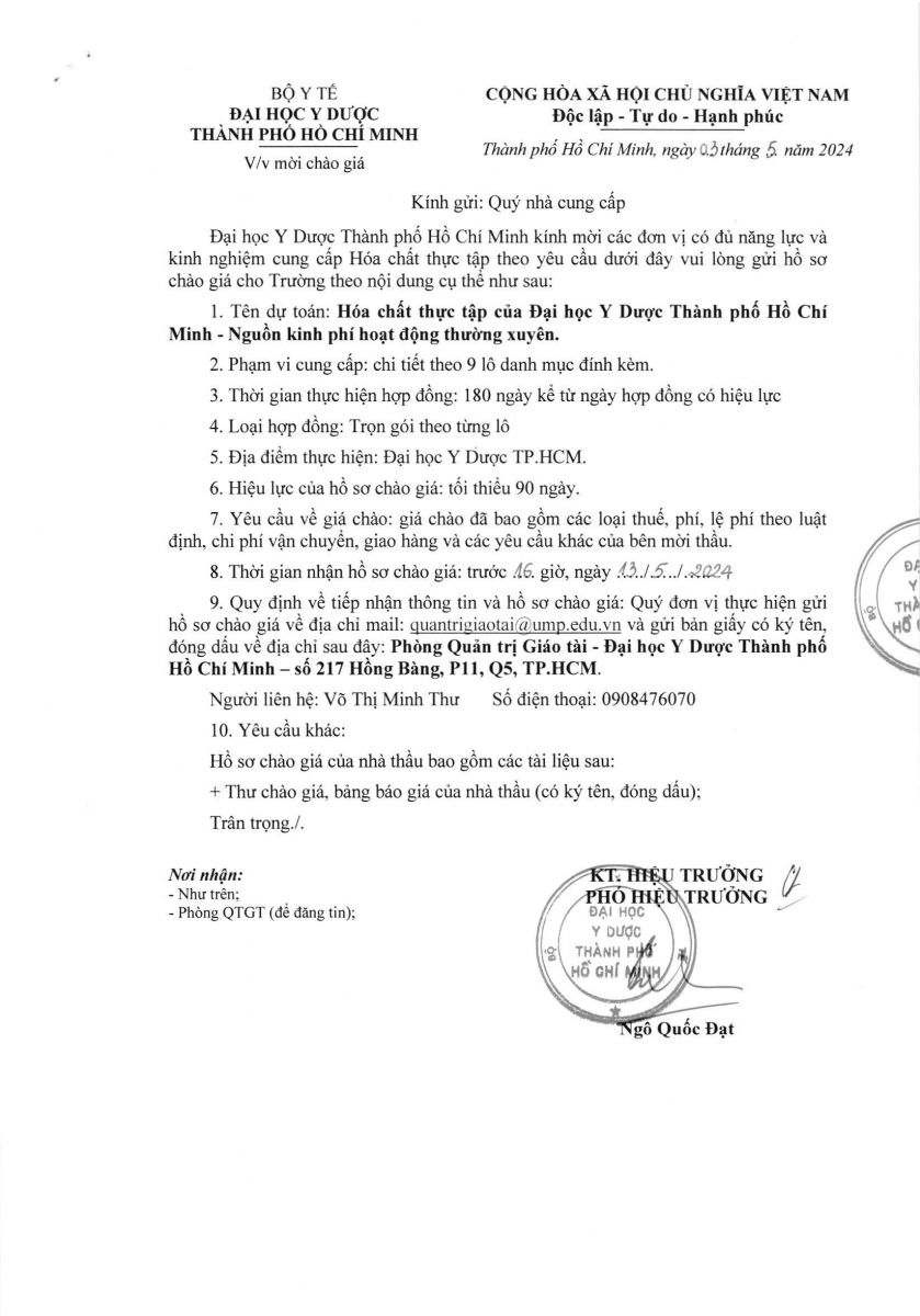 Thời gian nhận hồ sơ chào giá: từ ngày ra thông báo đến trước 16 giờ 00' ngày 13/5/2024