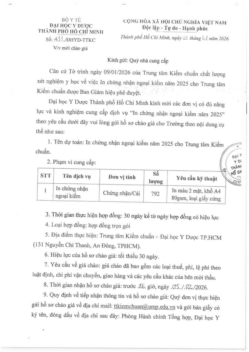 Thời gian nhận hồ sơ chào giá: từ ngày ra thông báo đến trước 16 giờ, ngày 05/02/2026