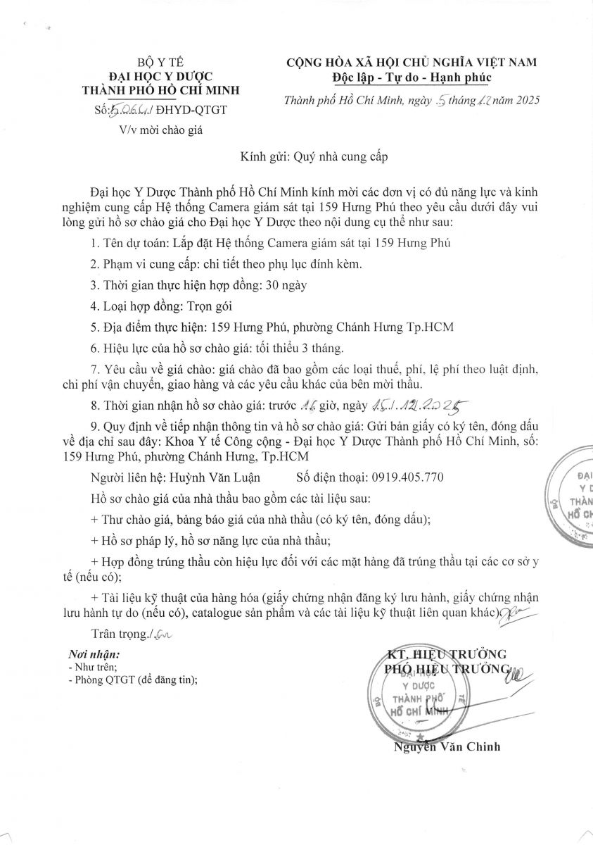 Thời gian nhận hồ sơ chào giá: từ ngày ra thông báo đến trước 16 giờ, ngày 15/12/2025