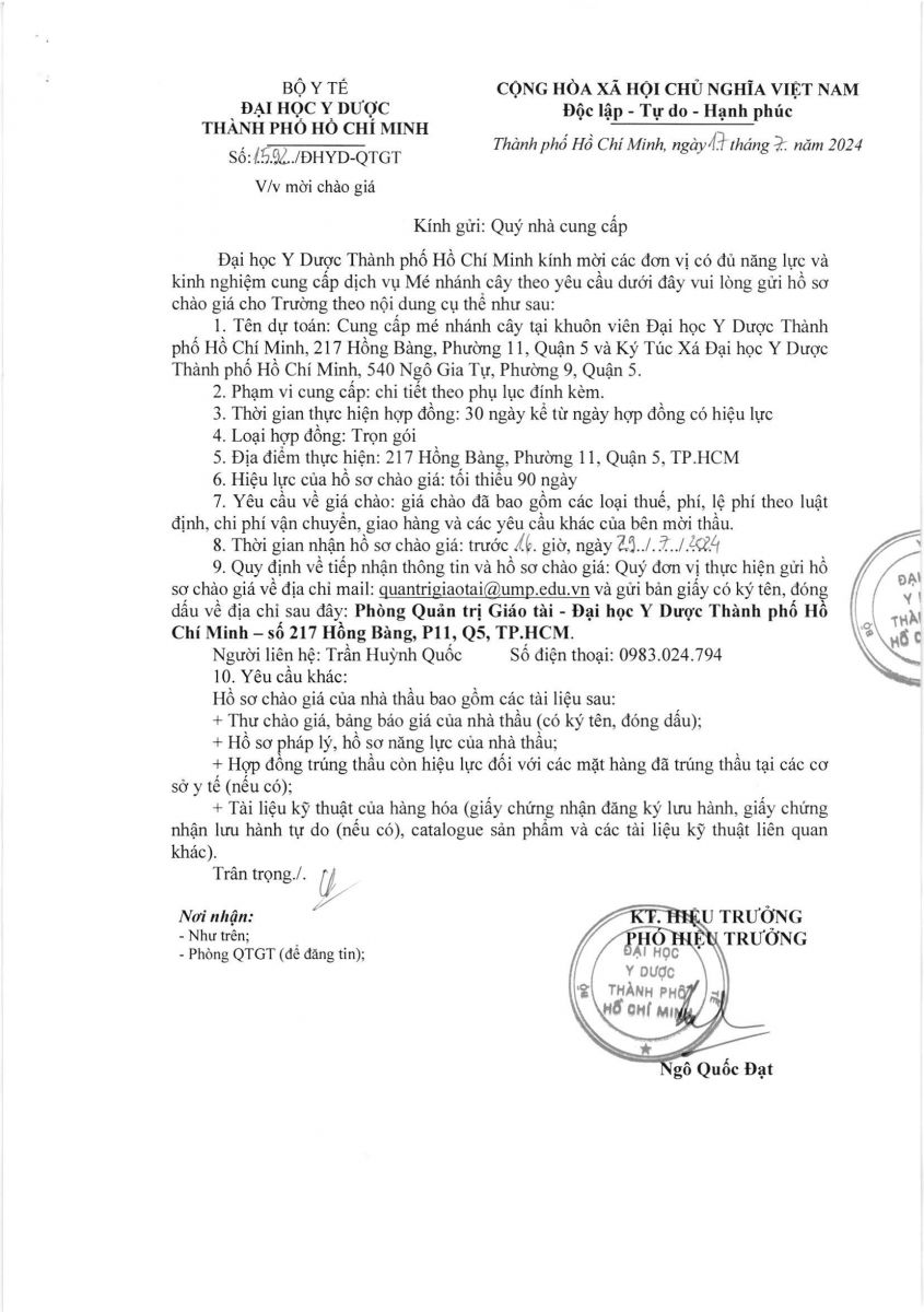 Thời gian nhận hồ sơ chào giá: từ ngày ra thông báo đến trước 16 giờ 00 ngày 29/7/2024