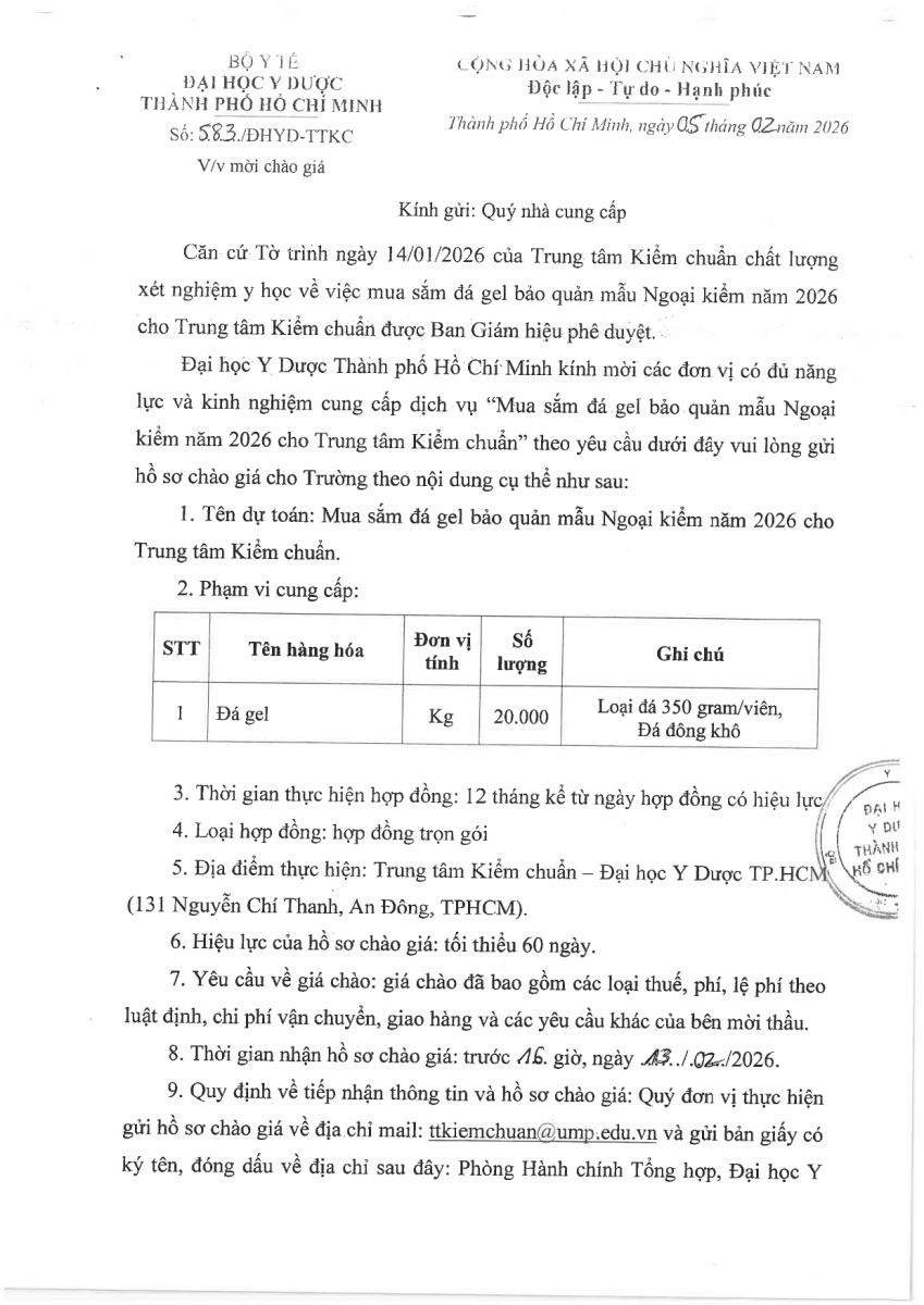 Thời gian nhận hồ sơ chào giá: từ ngày ra thông báo đến trước 16 giờ, ngày 13/02/2026