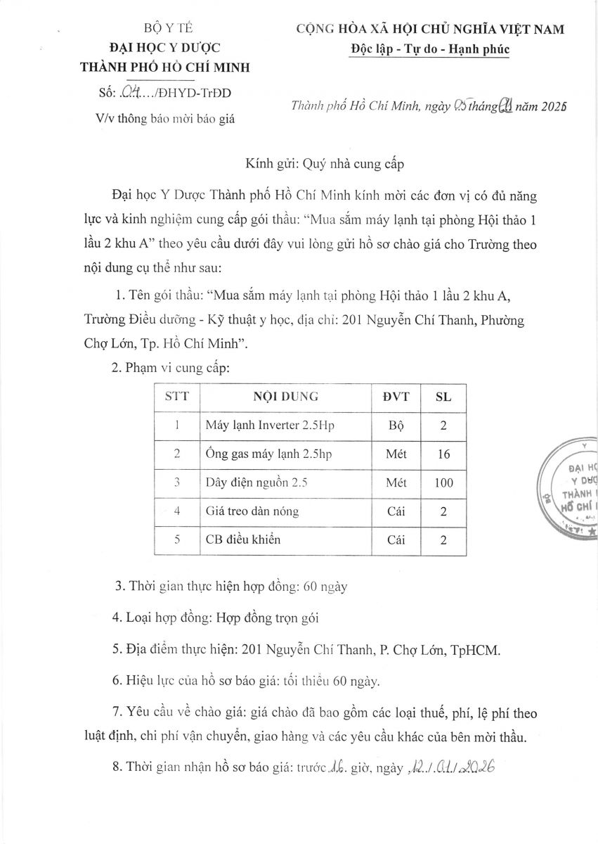 Thời gian nhận hồ sơ chào giá: từ ngày ra thông báo đến trước 16 giờ 00 ngày 12/01/2026