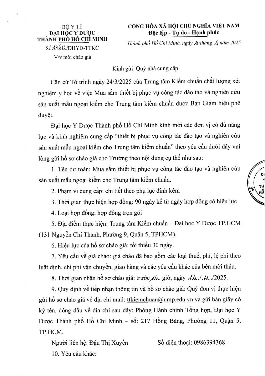 Thời gian nhận hồ sơ chào giá: từ ngày ra thông báo đến 16 giờ, ngày 24/4/2025Phụ lục đính kèm