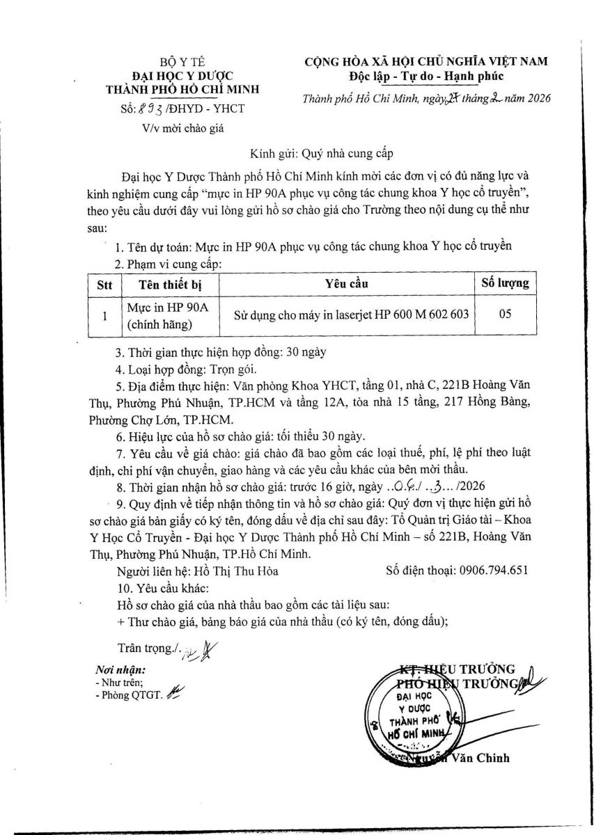 Thời gian nhận hồ sơ chào giá: từ ngày ra thông báo đến trước 16 giờ, ngày 06/03/2026