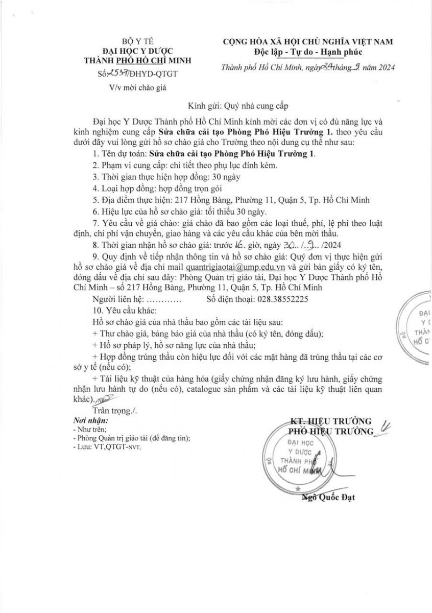 Thời gian nhận hồ sơ chào giá: từ ngày ra thông báo đến trước 16 giờ 00 ngày 30/9/2024