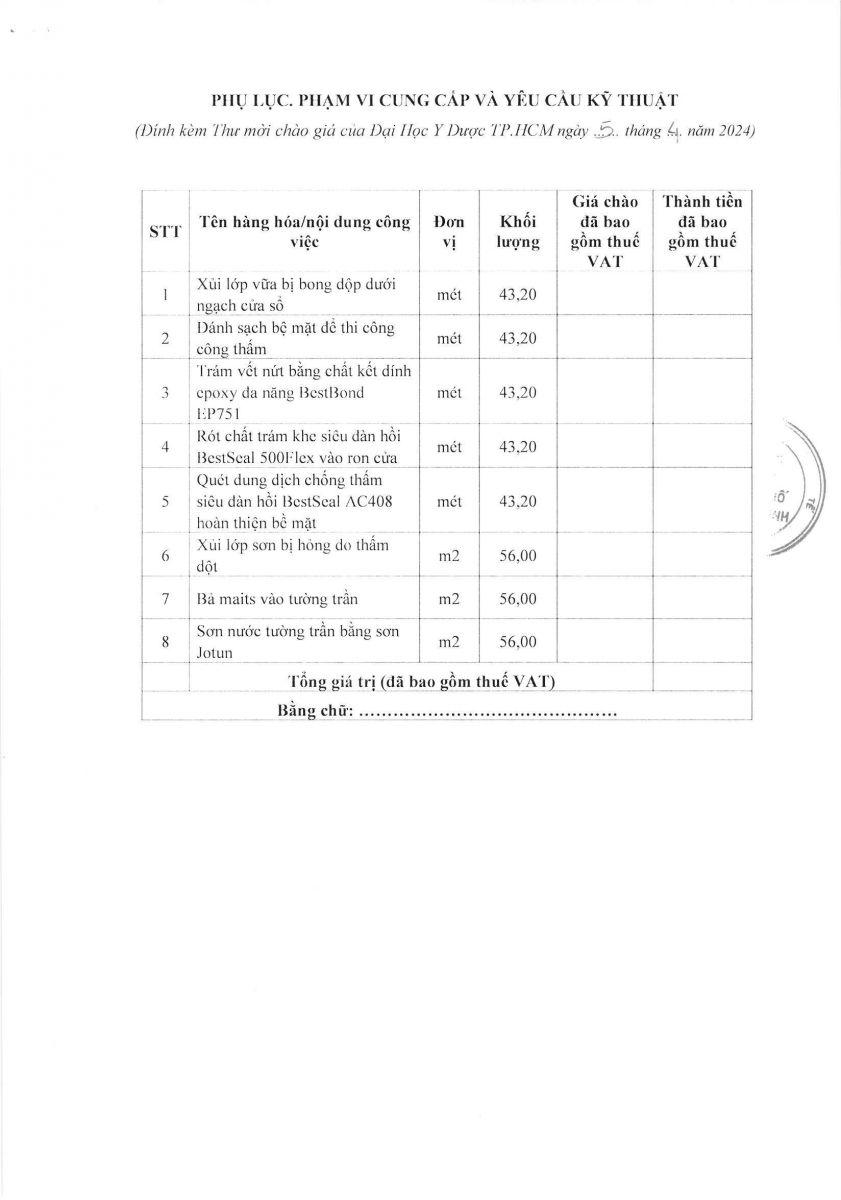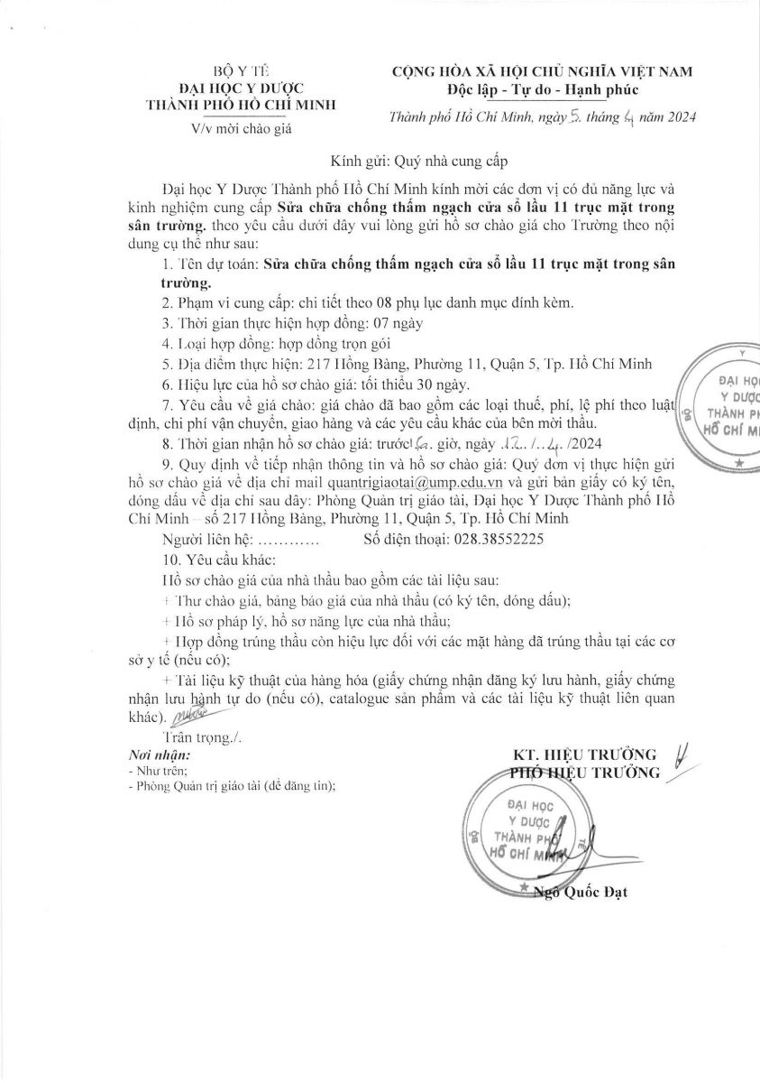 Thời gian nhận hồ sơ chào giá: từ ngày ra thông báo đến trước 16 giờ 00' ngày 12/4/2024