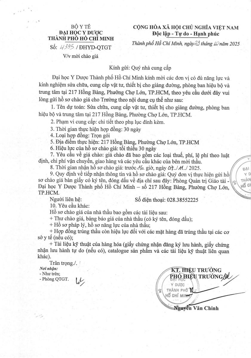Thời gian nhận hồ sơ chào giá: từ ngày ra thông báo đến trước 16 giờ, ngày 07/11/2025