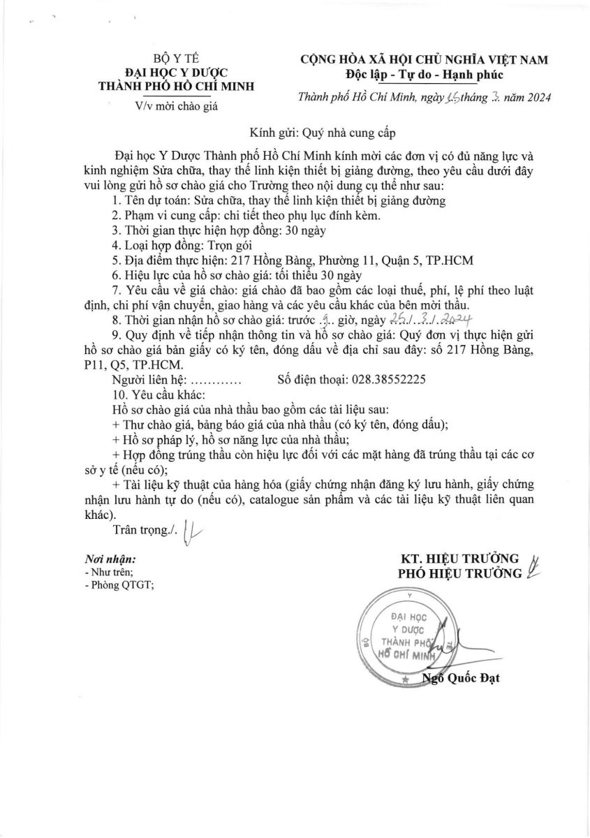 Thời gian nhận hồ sơ chào giá: từ ngày ra thông báo đến trước 09 giờ 00' ngày 25/3/2024