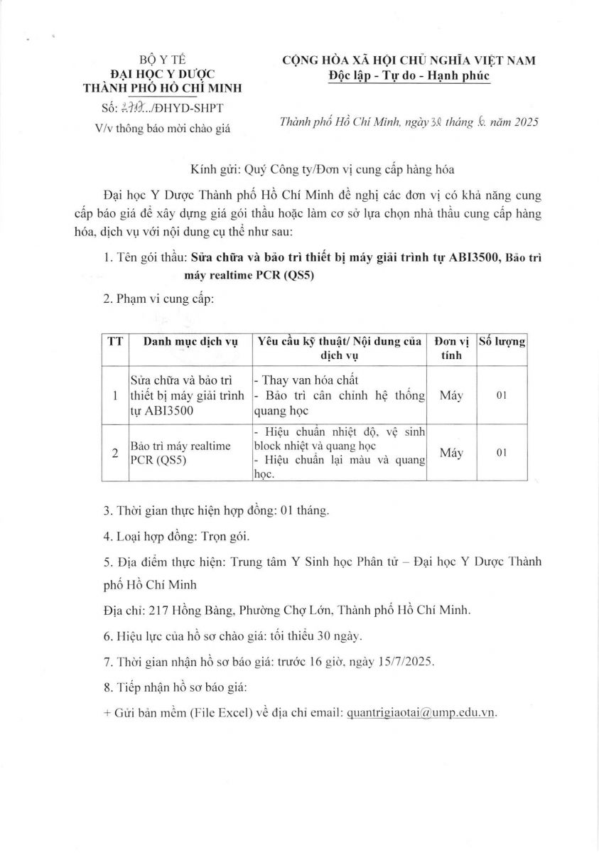 Thời gian nhận hồ sơ chào giá: từ ngày thông báo đến trước 16 giờ, ngày 15/7/2025