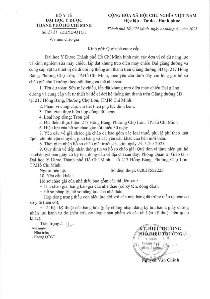 Thời gian nhận hồ sơ chào giá: từ ngày thông báo đến trước 16 giờ, ngày 17/7/2025