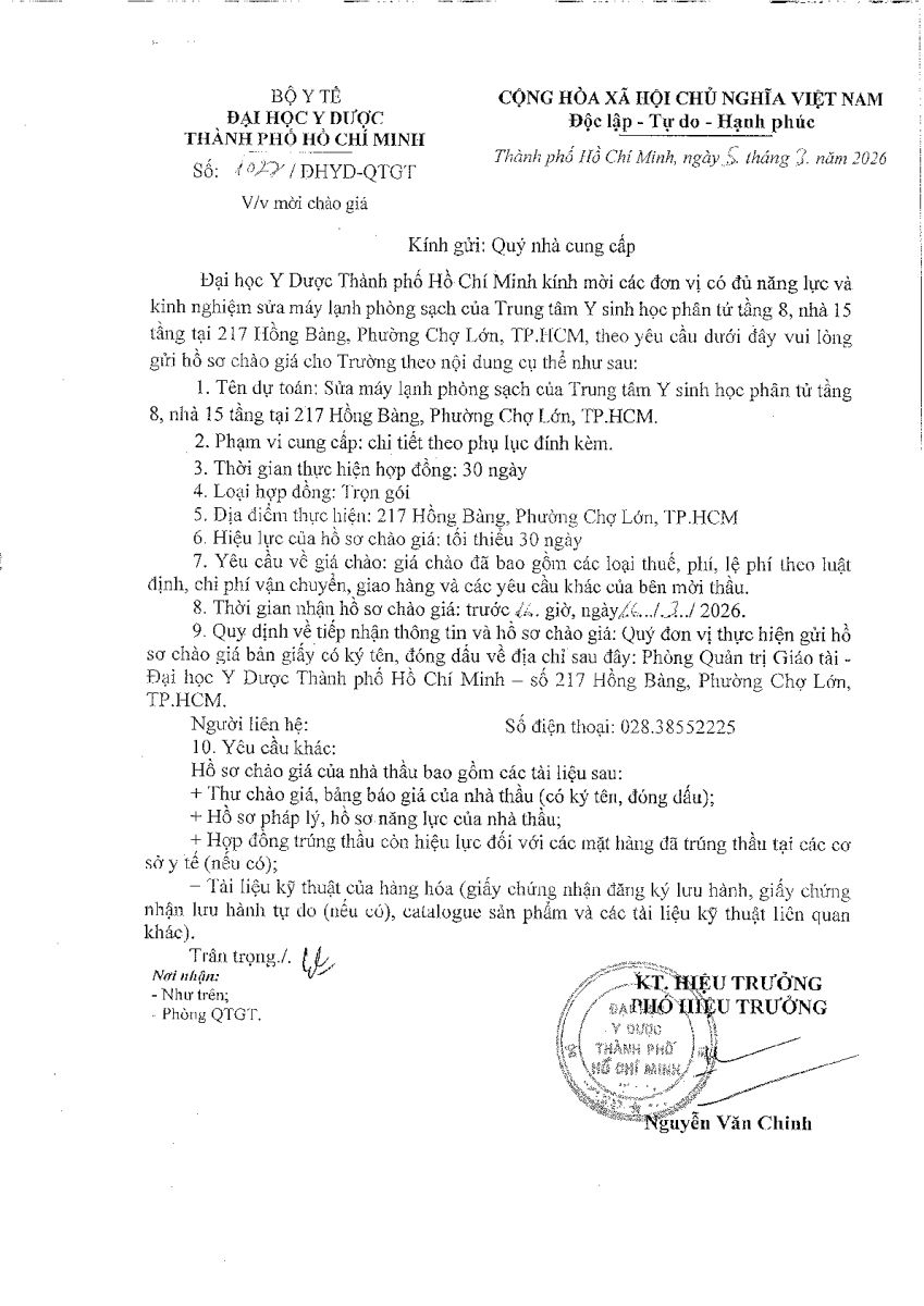 Thời gian nhận hồ sơ chào giá: từ ngày ra thông báo đến trước 16 giờ 00, ngày 16/3/2026