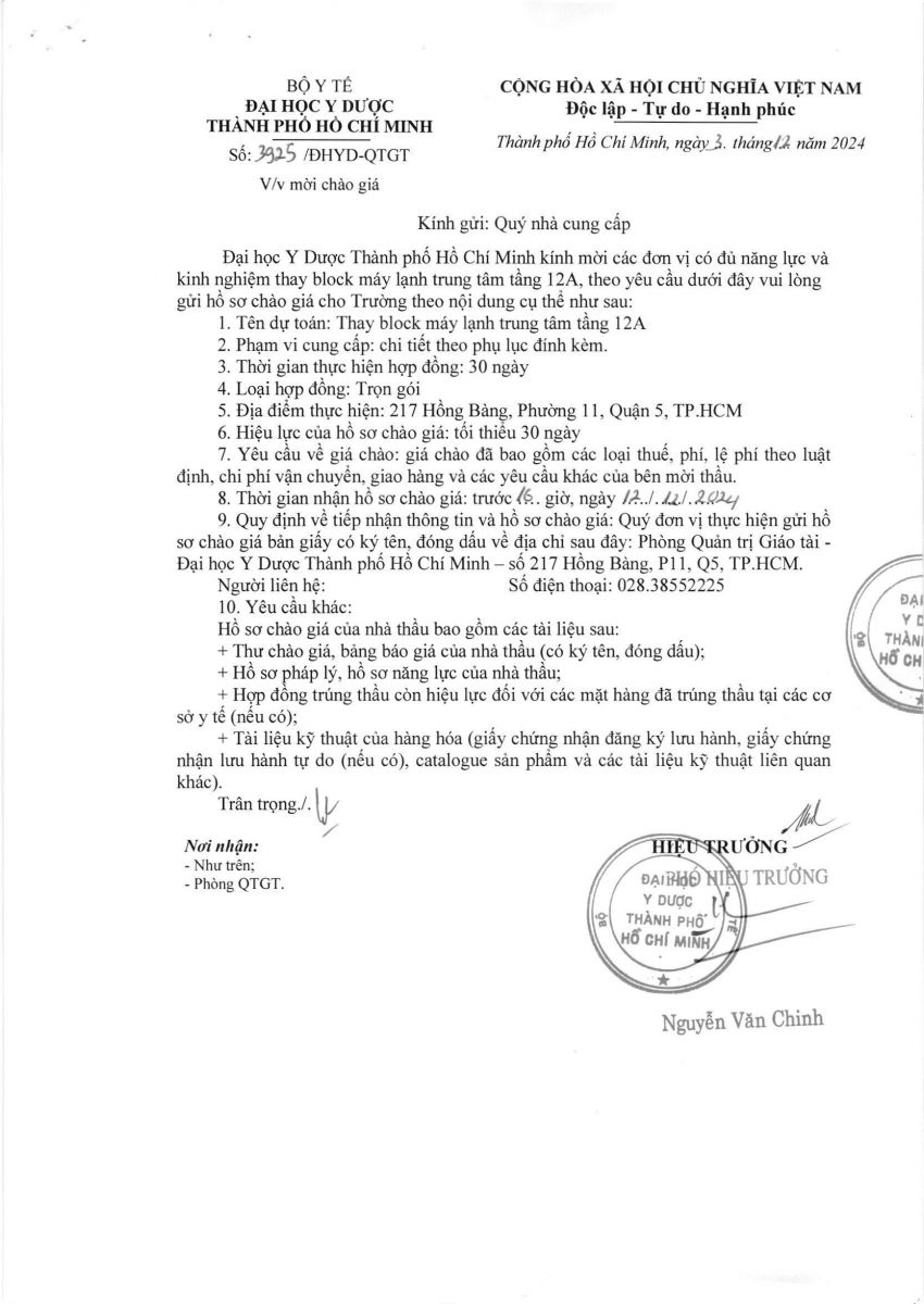 Thời gian nhận hồ sơ chào giá: từ ngày ra thông đến trước 16 giờ 00 ngày 12/12/2024