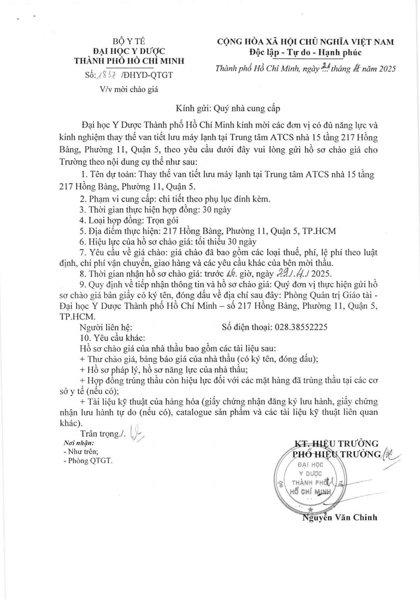 Thời gian nhận hồ sơ chào giá: từ ngày ra thông báo đến trước 16 giờ, ngày 29/4/2025
