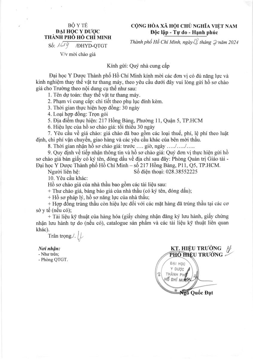 Thời gian nhận hồ sơ chào giá: từ ngày ra thông báo đến trước 10 giờ 00' ngày 31/7/2024
