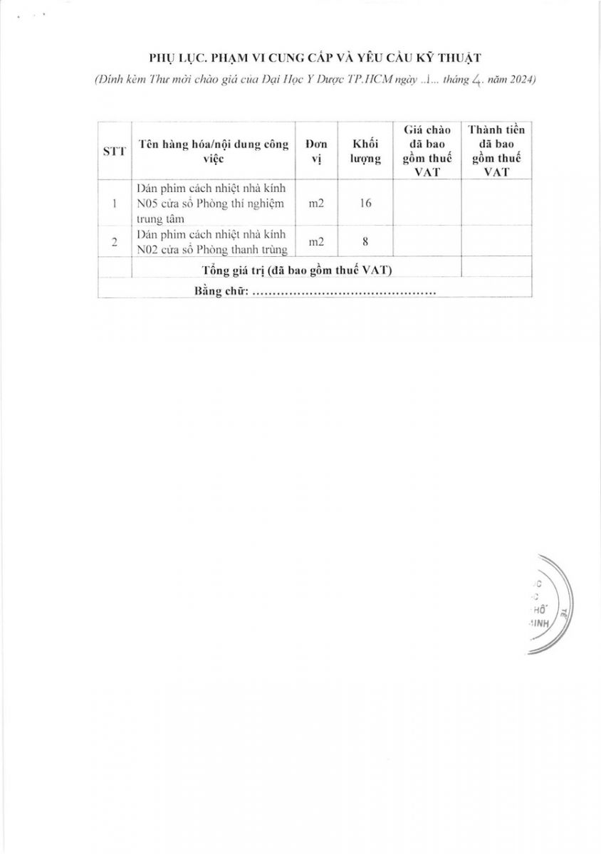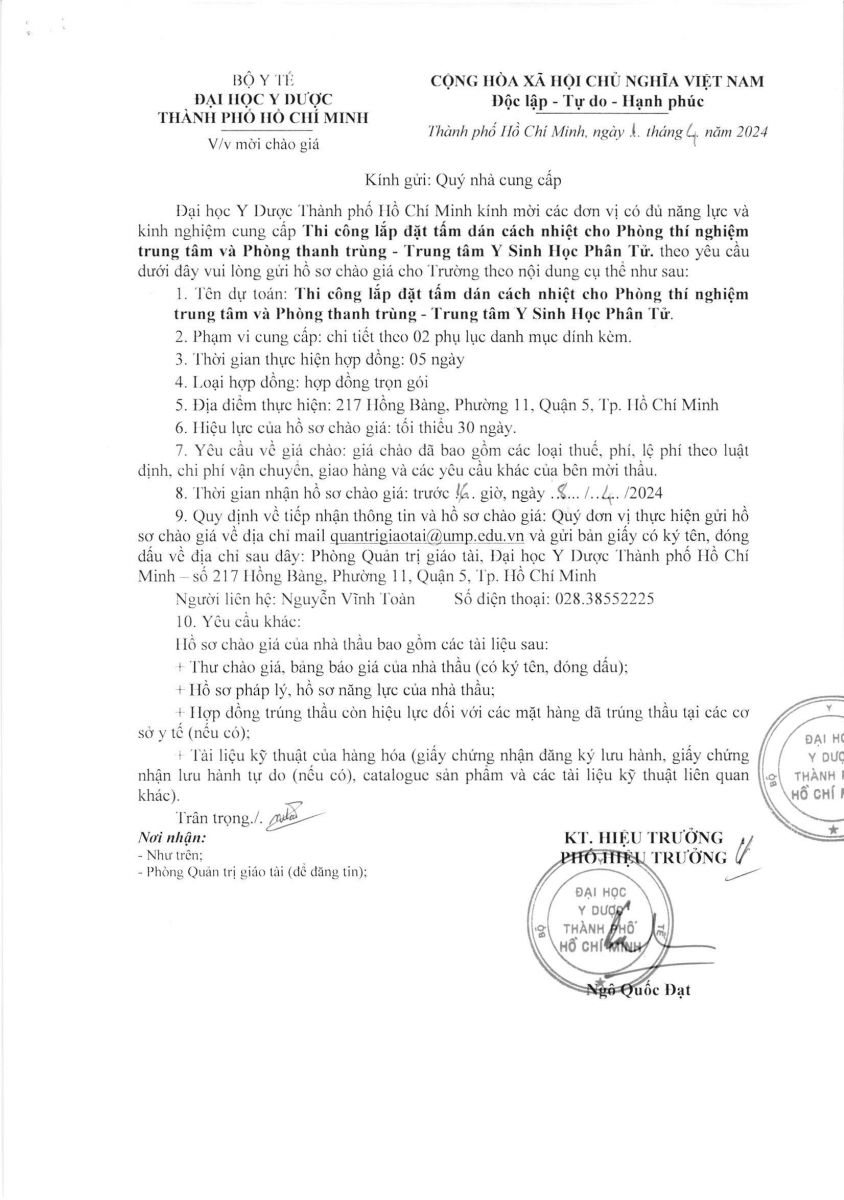 Thời gian nhận hồ sơ chào giá: từ ngày ra thông báo đến trước 16 giờ 00' ngày 08/4/2024