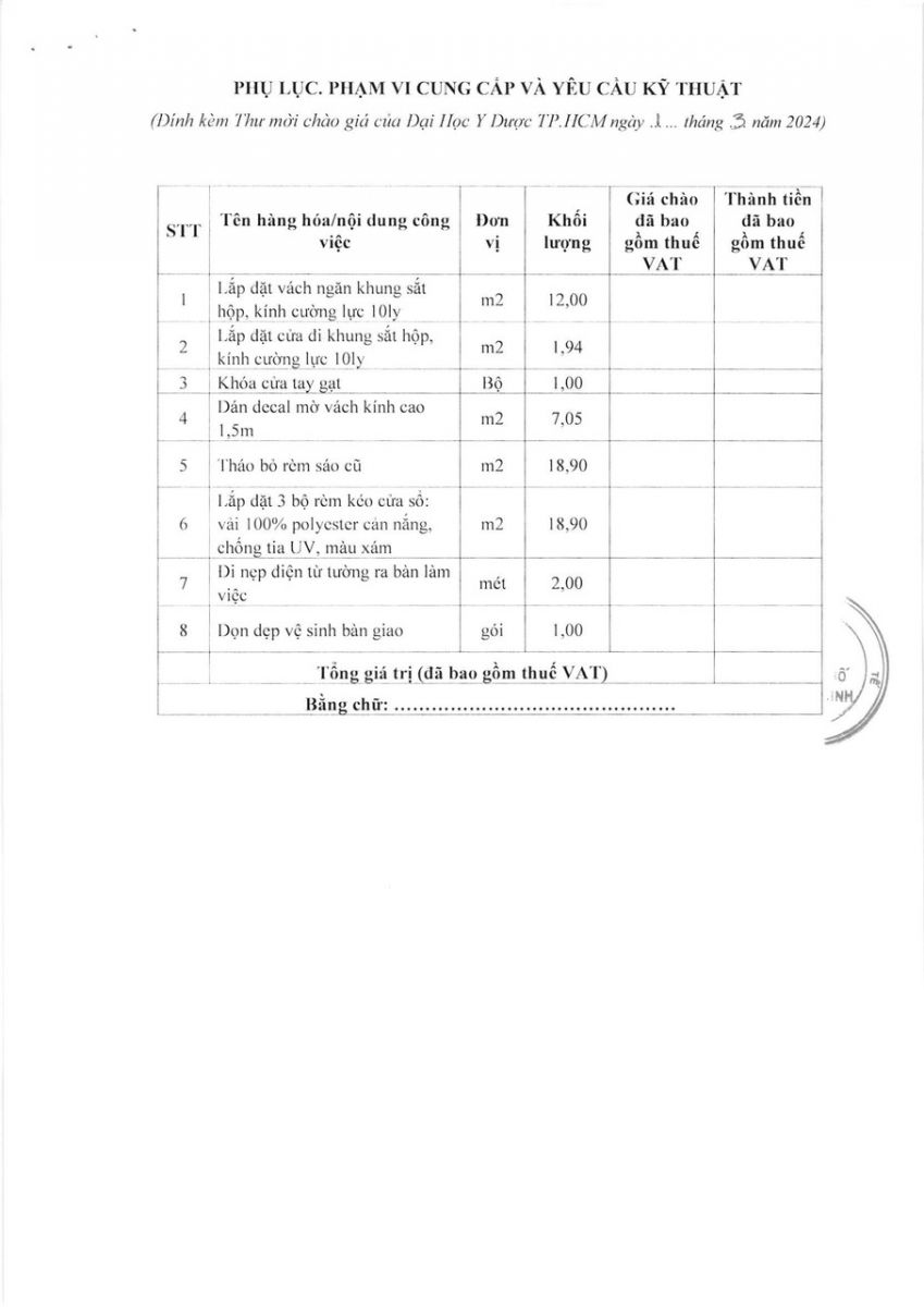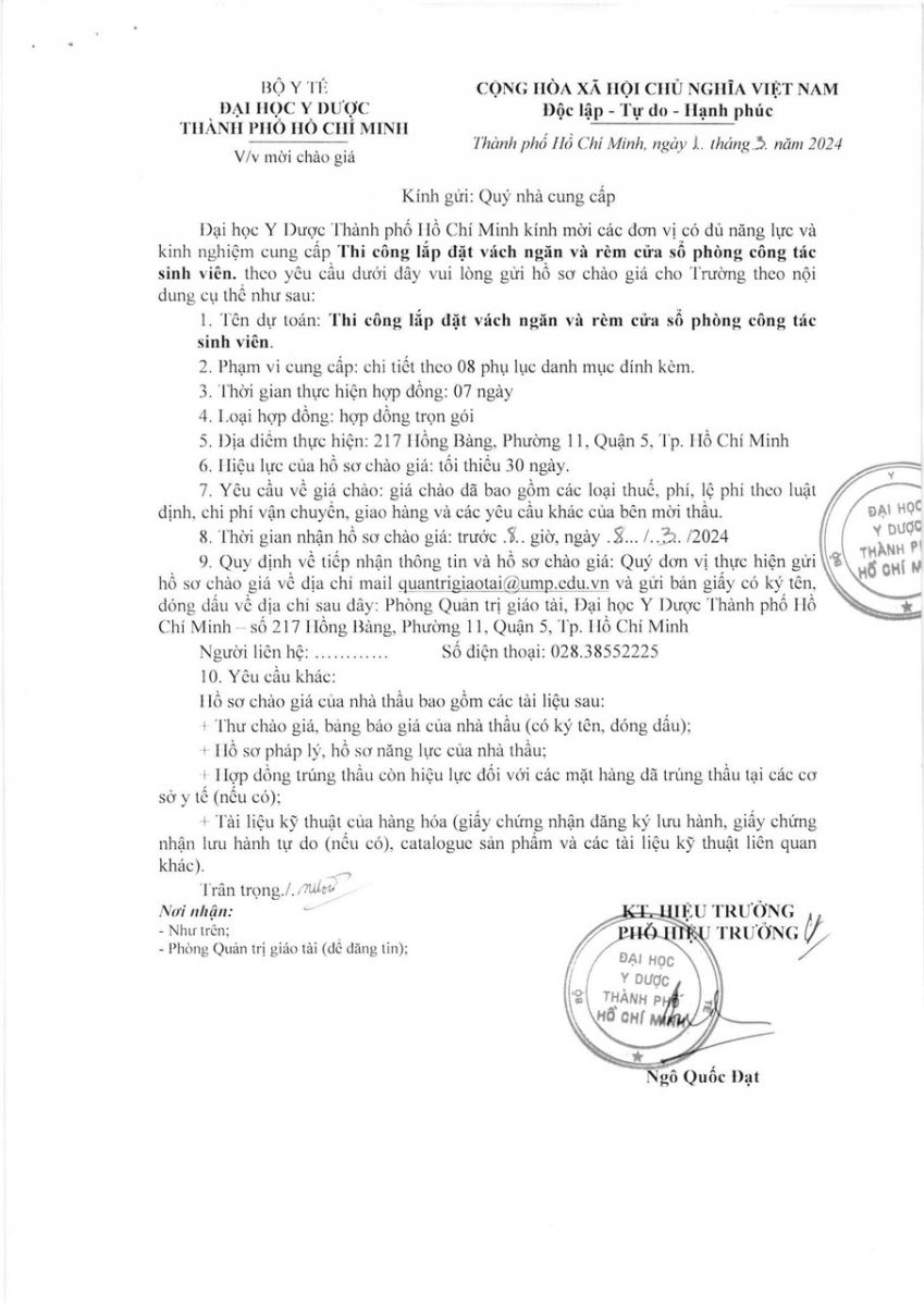 Thời gian nhận hồ sơ chào giá: từ ngày ra thông báo đến trước 08 giờ 00' ngày 08/3/2024