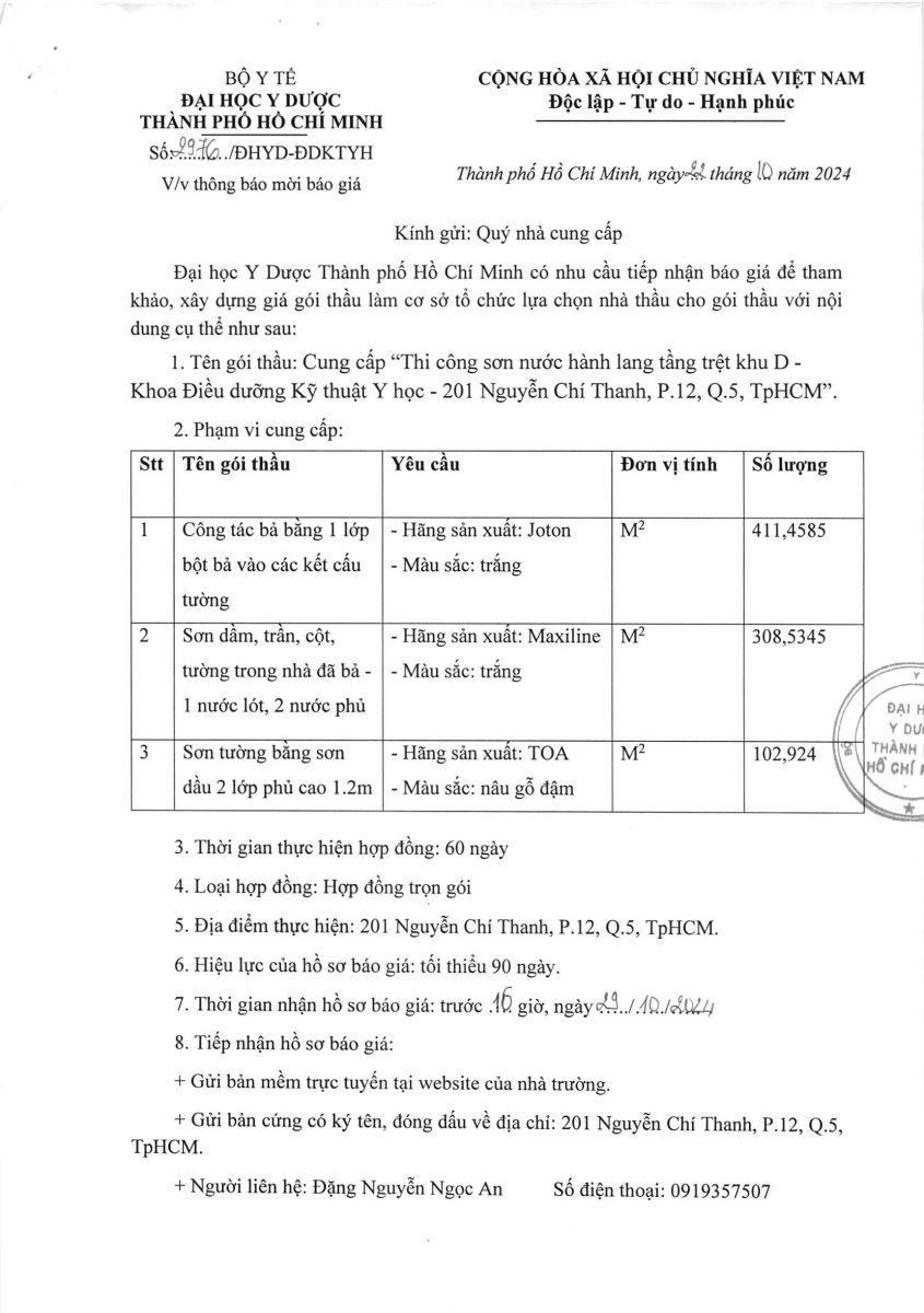 Thời gian nhận hồ sơ chào giá: từ ngày ra thông báo đến trước 16 giờ 00 ngày 29/10/2024