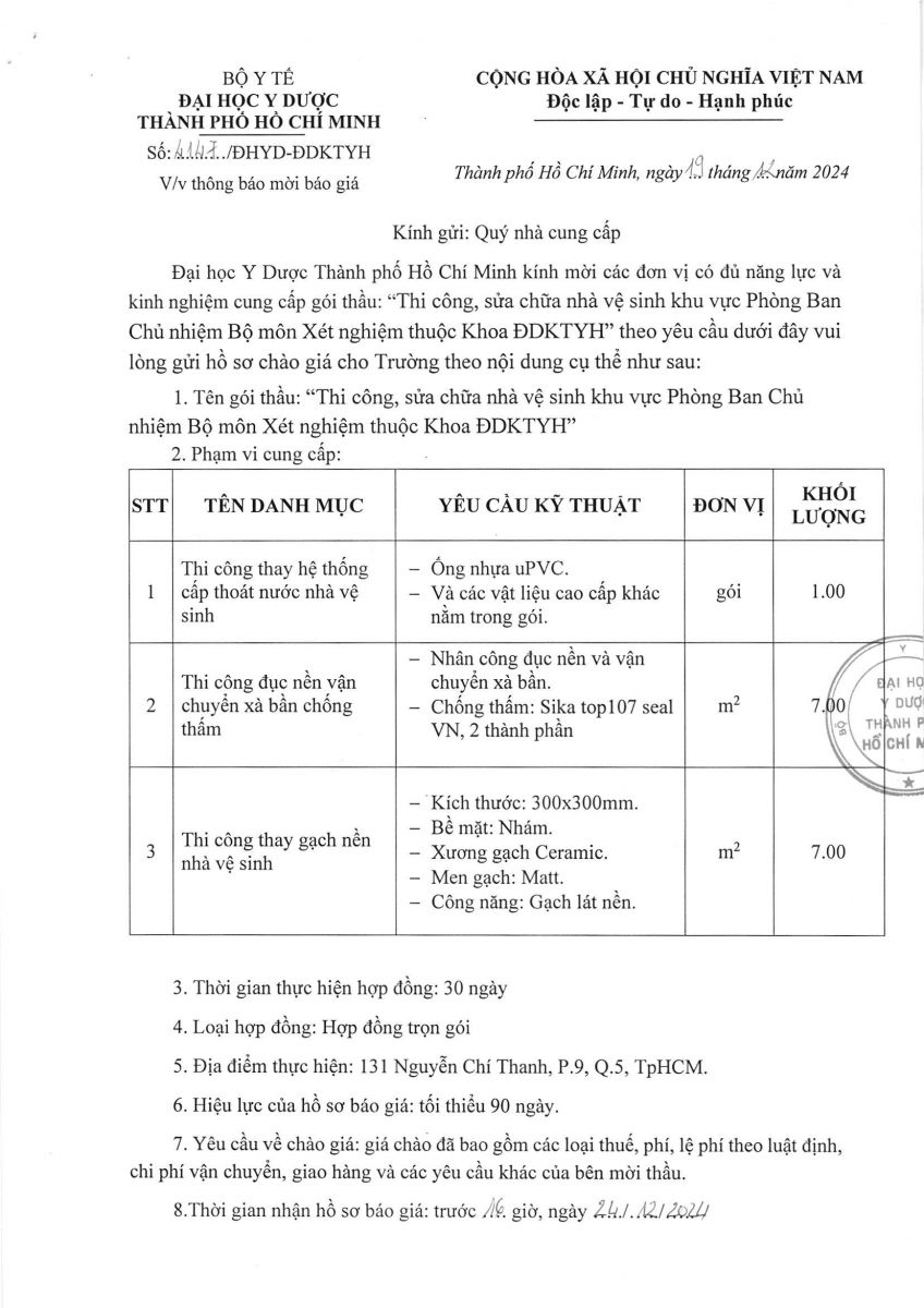 Thời gian nhận hồ sơ chào giá: từ ngày ra thông báo đến trước 16 giờ, ngày 24/12/2024