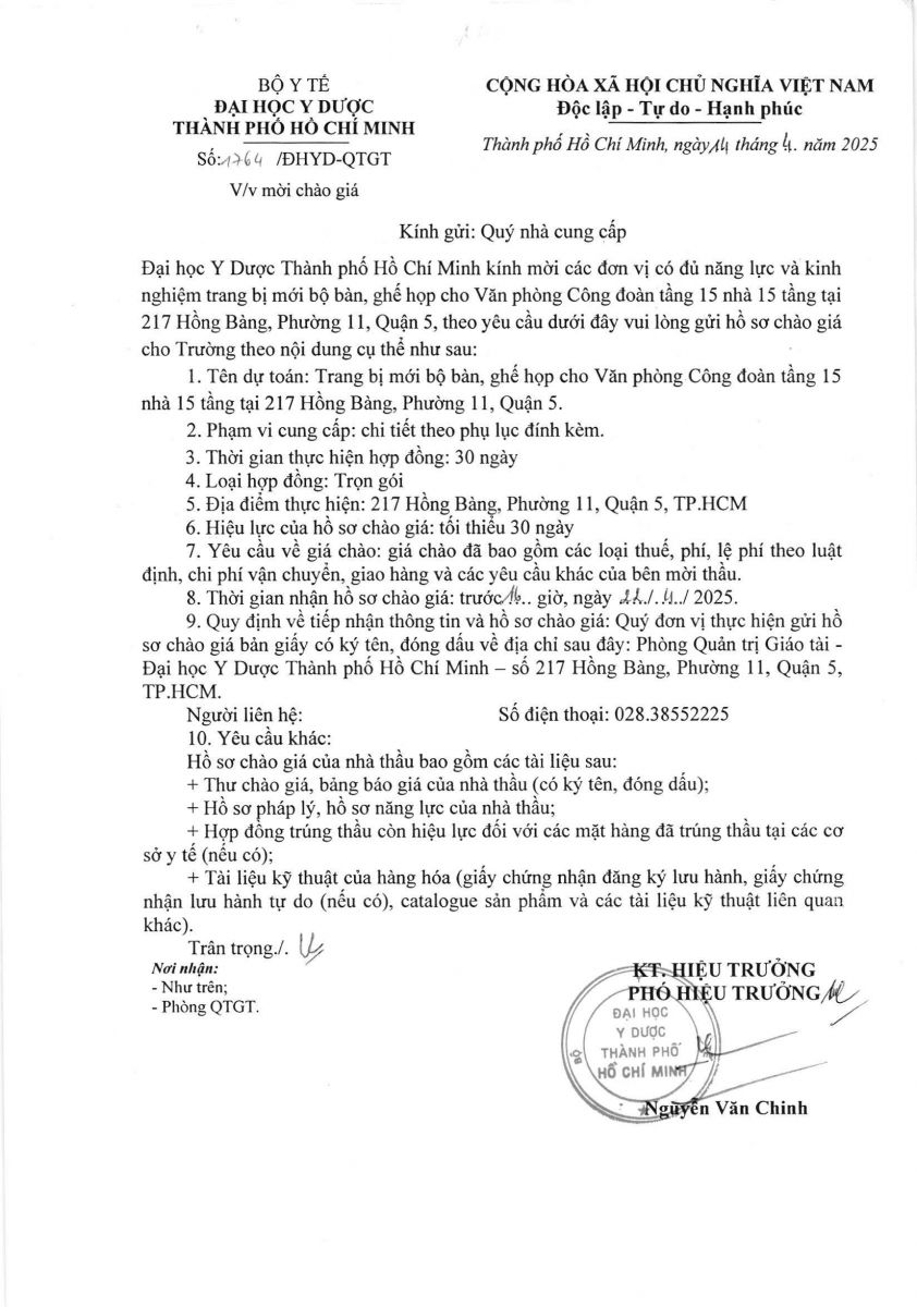 Thời gian nhận hồ sơ chào giá: từ ngày ra thông báo đến trước 16 giờ, ngày 22/4/2025