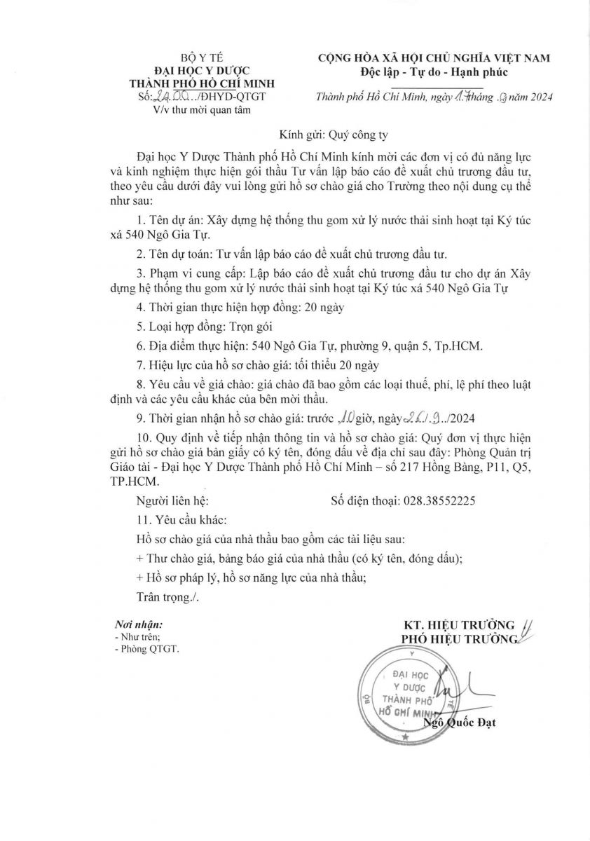 Thời gian nhận hồ sơ chào giá: từ ngày ra thông báo đến trước 10 giờ 00 ngày 26/9/2024