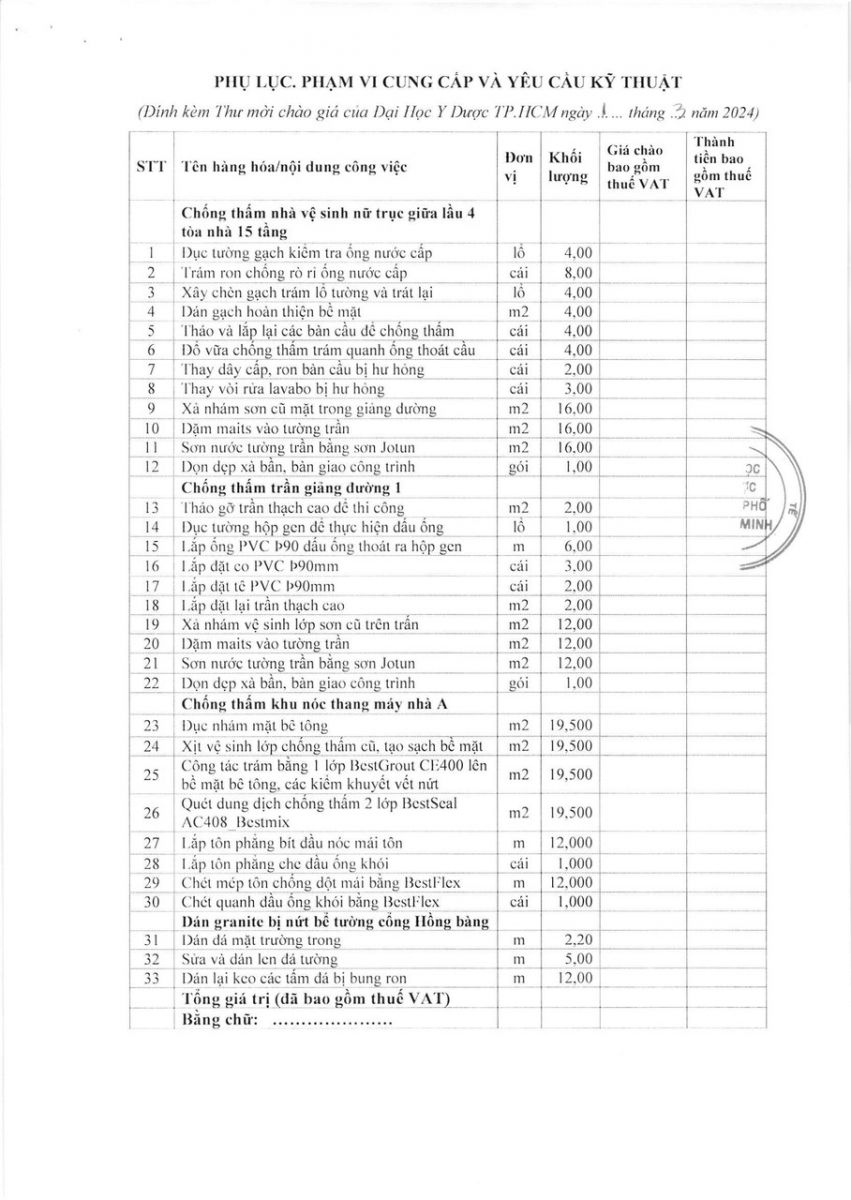 vx88 code mời chào giá: "Xử lý chống thấm nhà vệ sinh nữ trục giữa lầu 4 tòa nhà 15 tầng, GĐ 1, sàn nóc thang máy nhà A và sửa đá tường cổng Hồng Bàng" - vx88 esball vx88b