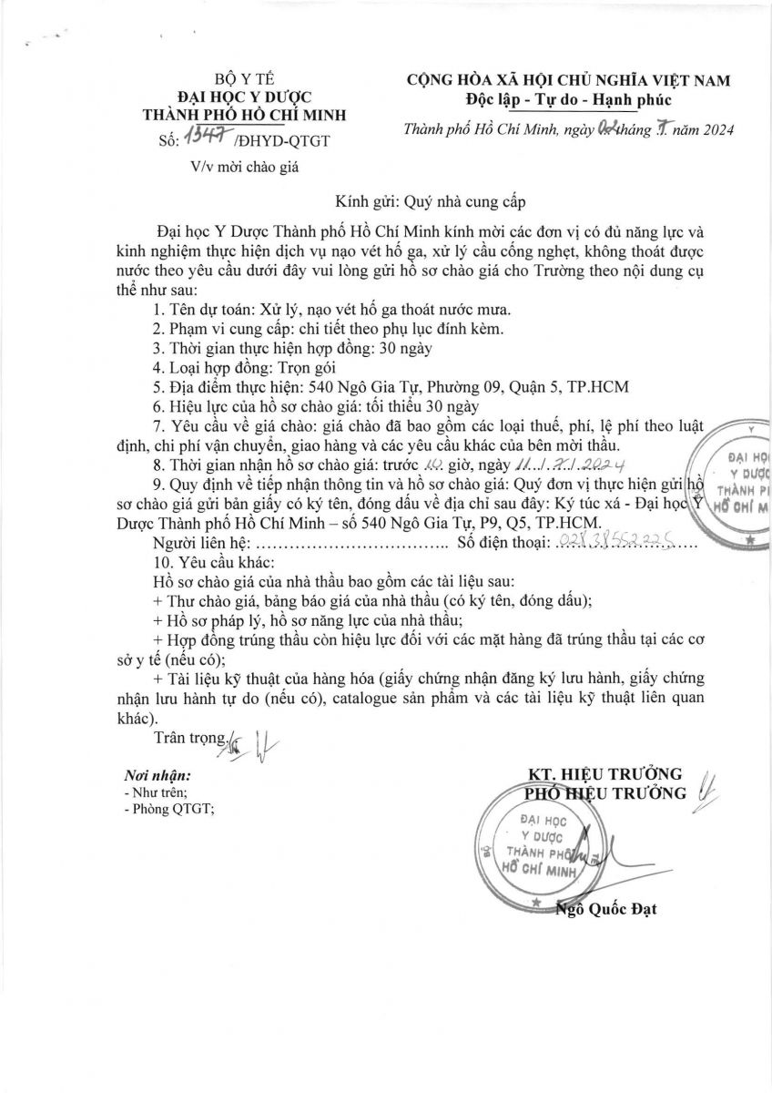 Thời gian nhận hồ sơ chào giá: từ ngày ra thông báo đến trước 10 giờ 00 ngày 11/7/2024