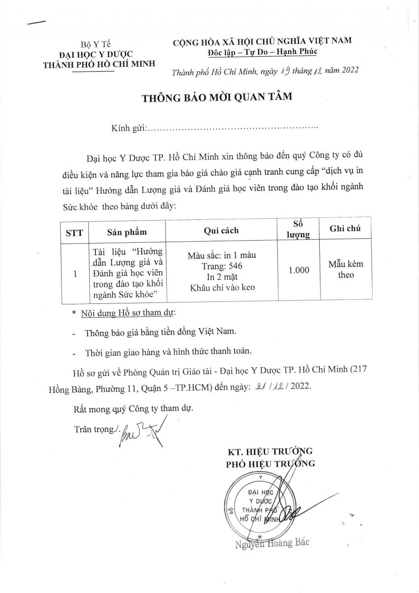 Thời gian nhận hồ sơ chào giá: từ ngày ra thông báo đến ngày 21/12/2022