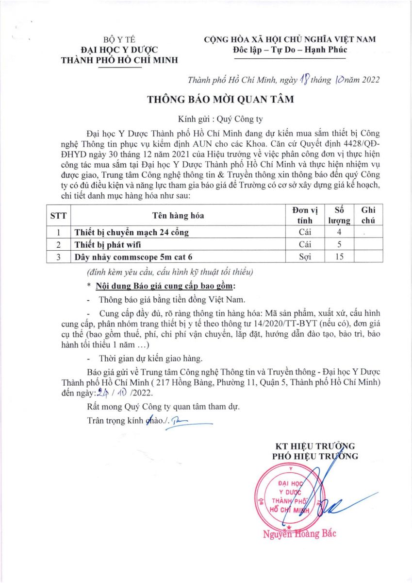 Thời gian nhận hồ sơ chào giá: từ ngày ra thông báo đến ngày 24/10/2022