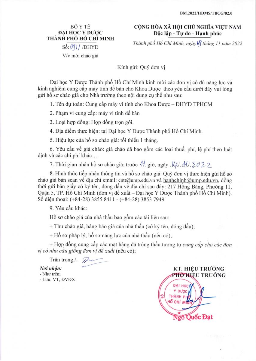 Thời gian nhận hồ sơ chào giá: từ ngày ra thông báo đến trước 11 giờ 00 ngày 14/11/2022