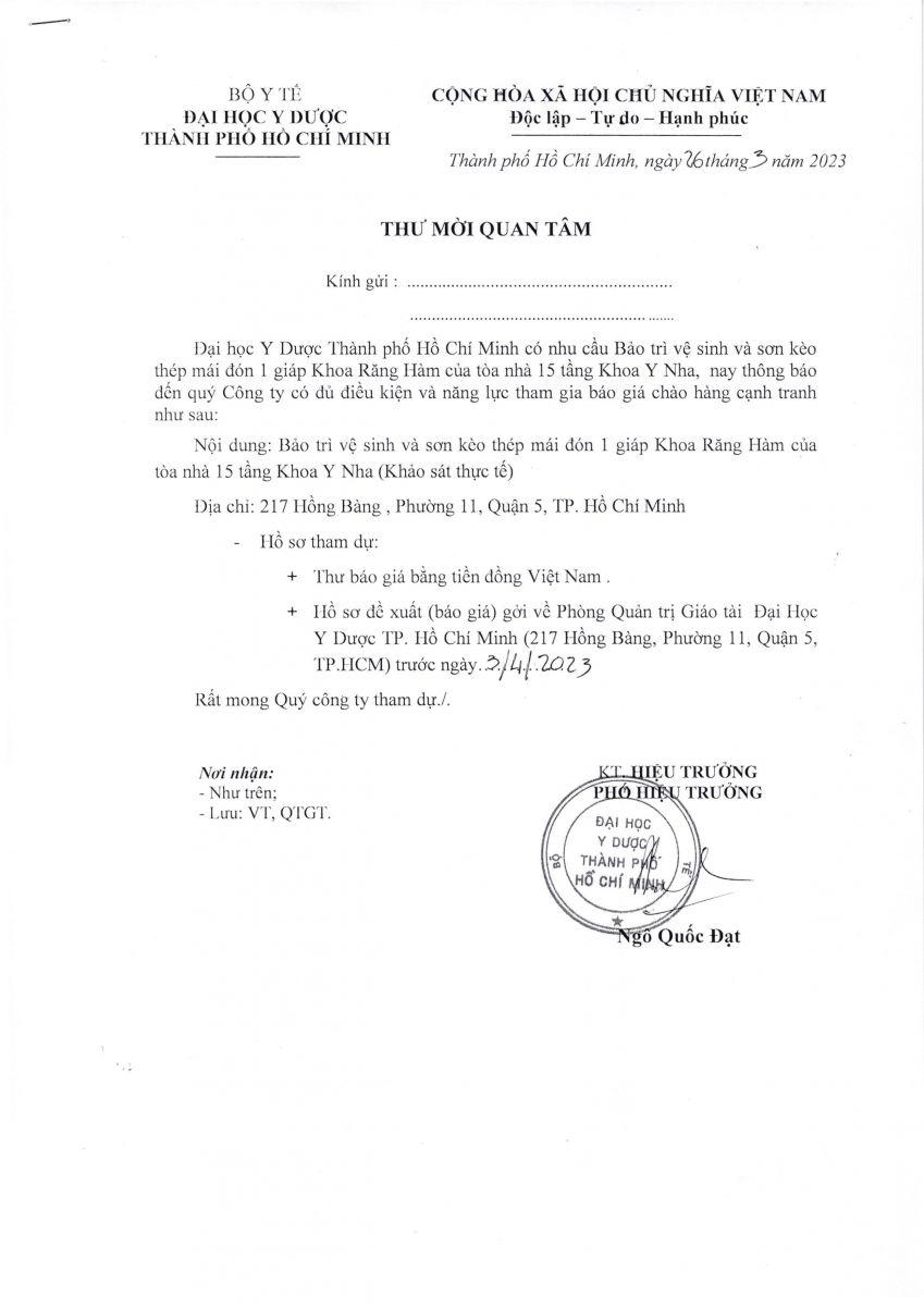 Thư mời quan tâm chào giá: "Bảo trì vệ sinh và sơn kèo thép mái đón 1 giáp khoa Răng Hàm Mặt của tòa nhà 15 tầng Khoa Y Nha" (Khảo sát thực tế) - vx88 esball TP.vx88m