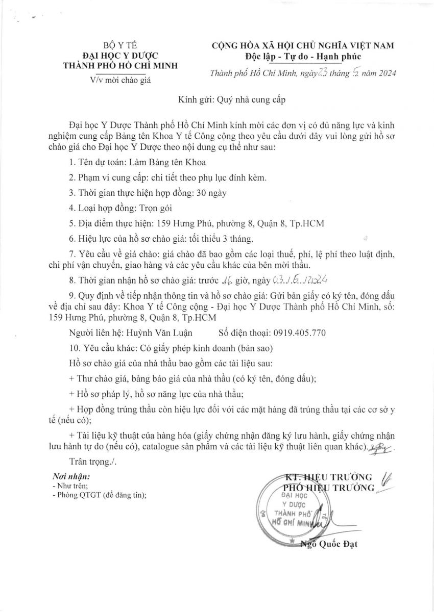Thời gian nhận hồ sơ chào giá: từ ngày ra thông báo đến trước 16 giờ 00' ngày 03/6/2024