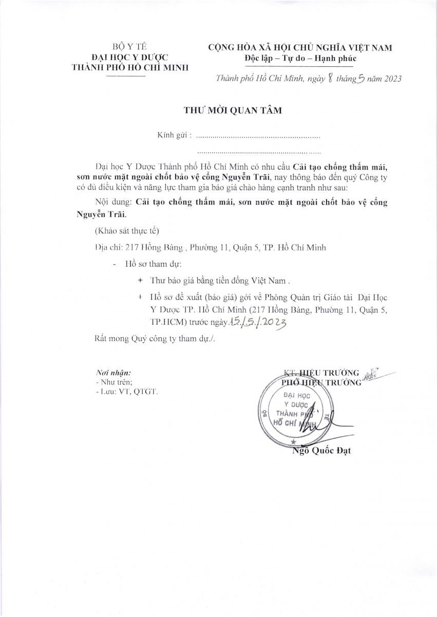 Thời gian nhận hồ sơ chào giá: từ ngày ra thông báo đến trước ngày 15/5/2023