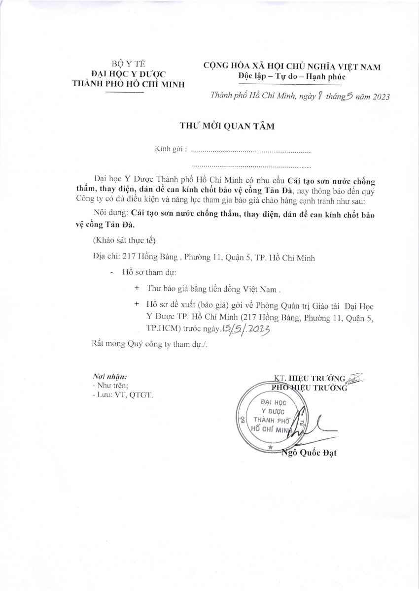 Thời gian nhận hồ sơ chào giá: từ ngày ra thông báo đến trước ngày 15/5/2023