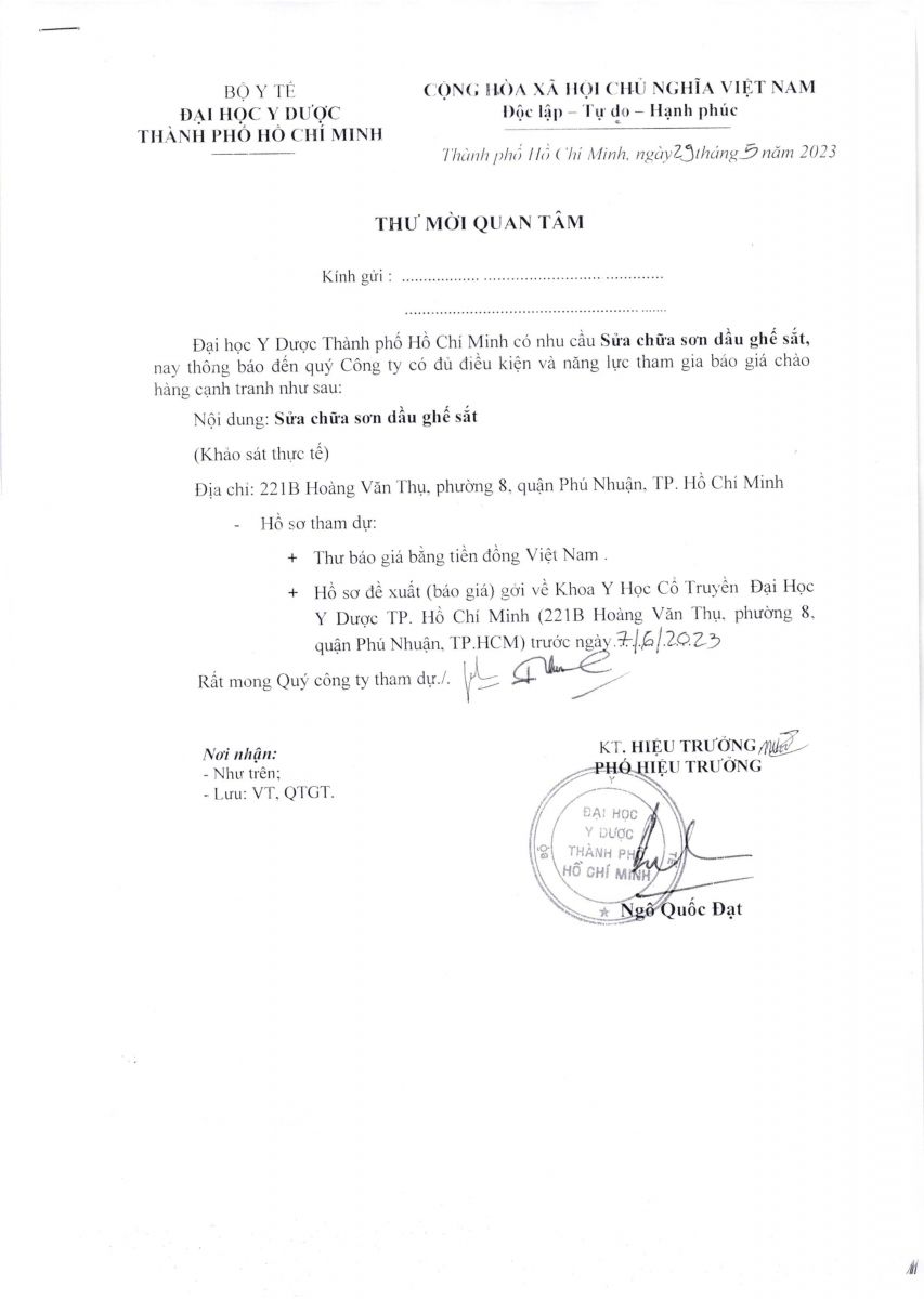 Thư mời quan tâm chào giá cung cấp dịch vụ: "Sửa chữa Sơn dầu ghế sắt - Khoa YHCT" (Khảo sát thực tế tại 221B Hoàng Văn Thụ,P8, Q.Phú Nhuận) - vx88 esball TP.vx88m