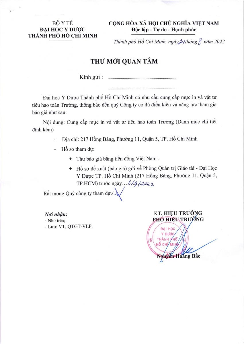 Thời gian nhận báo giá: từ ngày ra thông báo đến ngày 06/9/2022