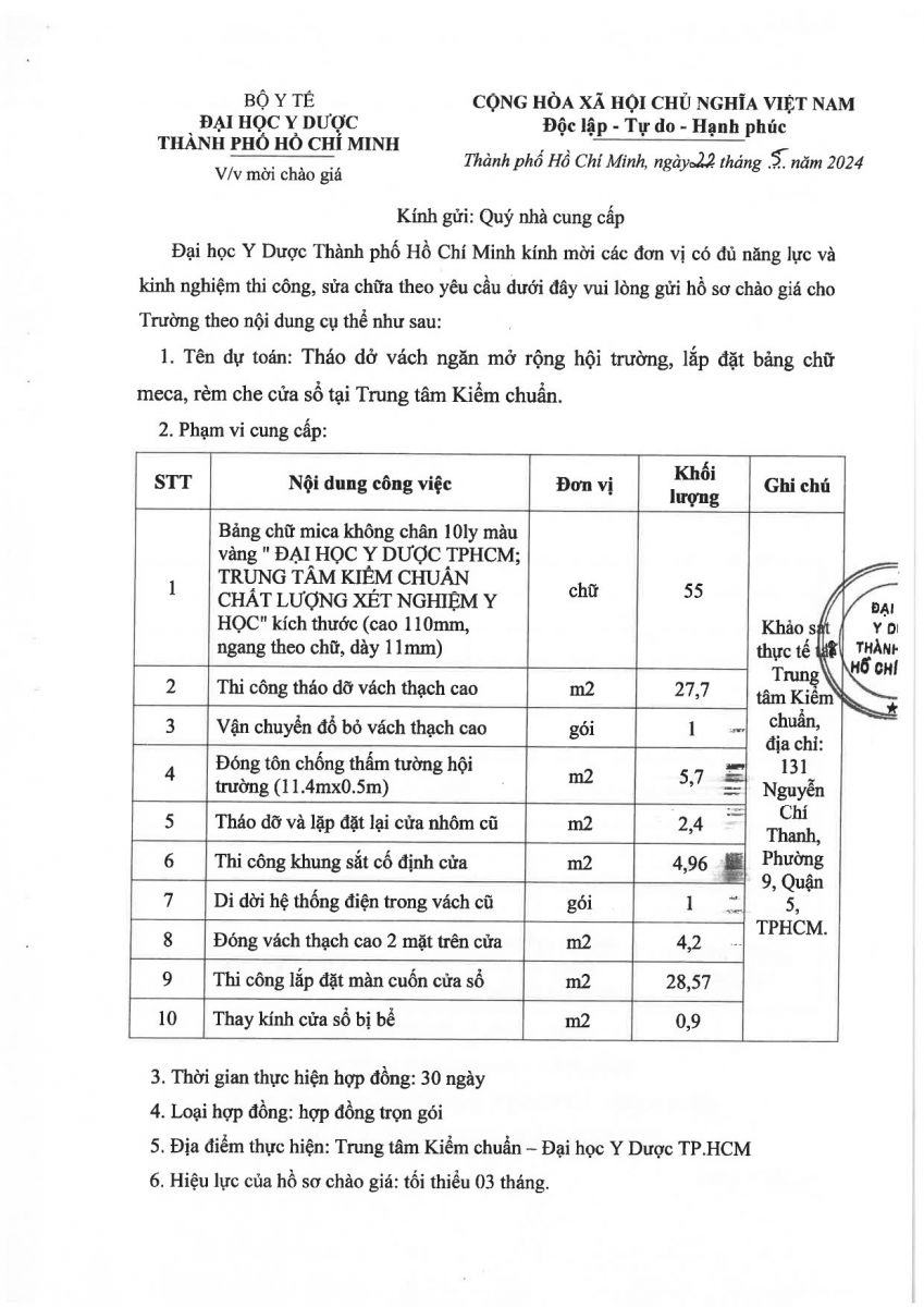 Thư mời quan tâm chào giá: "Tháo dở vách ngăn mở rộng hội trường, lắp đặt bảng chữ meca, rèm che cửa sổ tại vx88 esball Kiểm chuẩn" - vx88 esball Y dược TP.vx88m