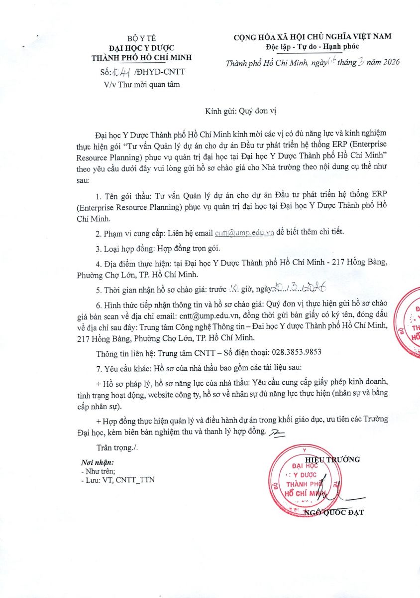 Thư mời quan tâm gói: Tư vấn Quản lý dự án cho dự án Đầu tư phát triển hệ thống ERP (Enterprise Resource Planning) phục vụ quản trị đại học tại vx88 esball Thành phố vx88m