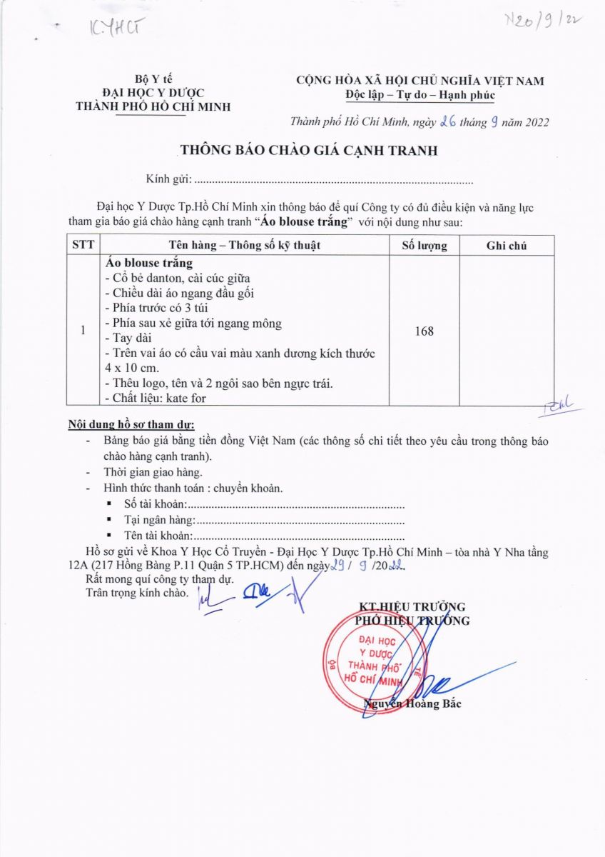 Thời gian nhận hồ sơ chào giá: từ ngày ra thông báo đến ngày 29/9/2022