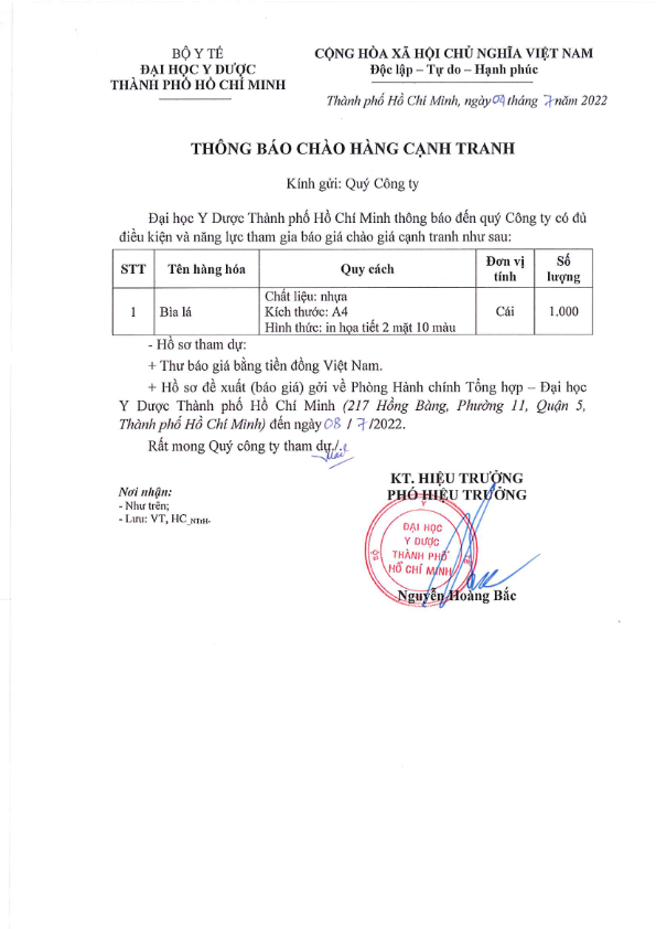 Thời gian nhận hồ sơ chào giá: từ ngày ra thông báo đến ngày 08/7/2022