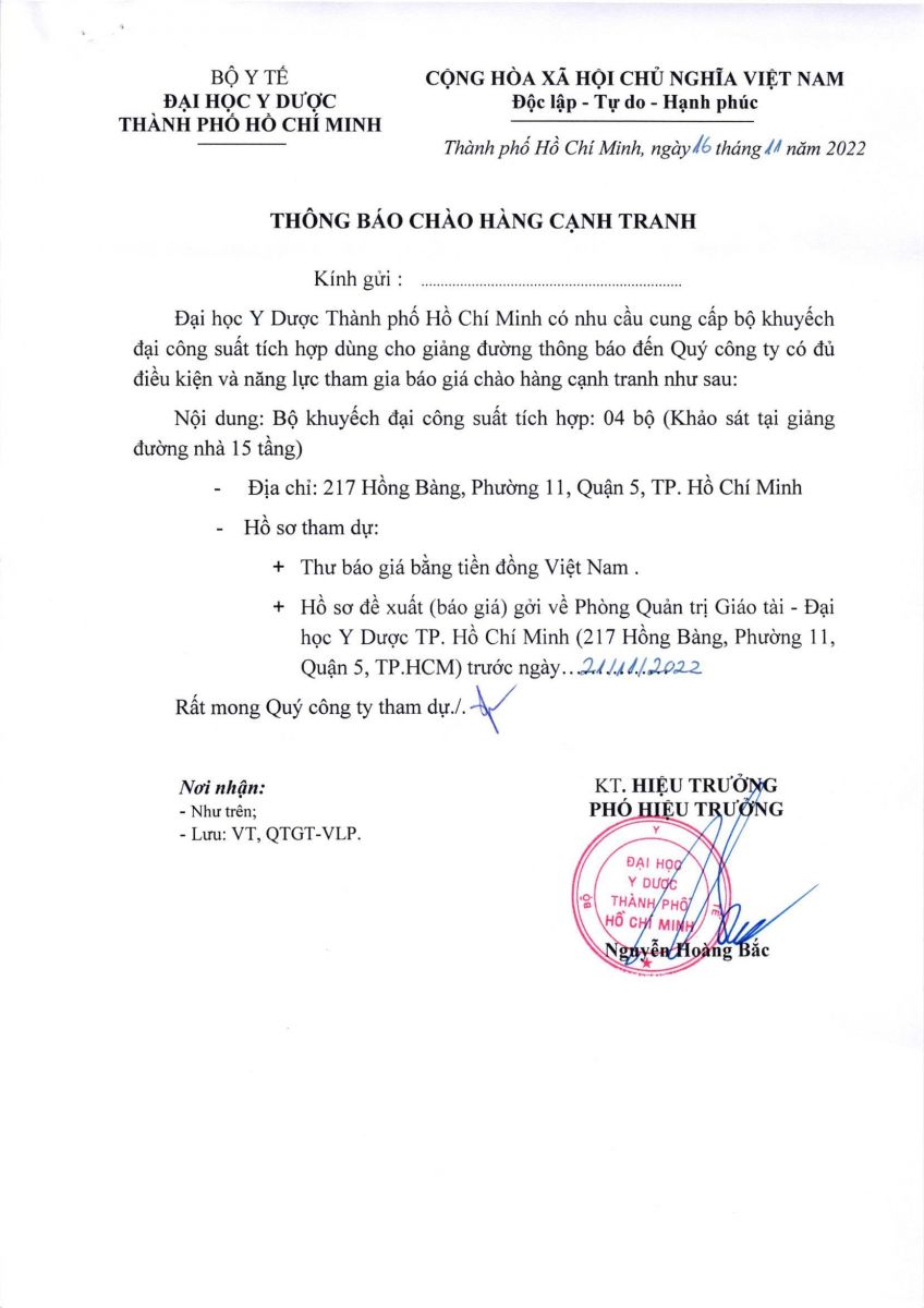 Thời gian nhận hồ sơ chào giá: từ ngày ra thông báo đến ngày 21/11/2022